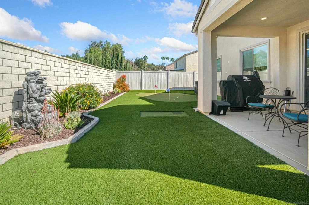 Built in 2023, this upgraded single-level home in Park Circle offers 3 bedrooms, 2 full bathrooms, and a private den with French doors, across approximately 2,082 square feet. Luxury vinyl plank flooring flows through an open layout, anchored by a spacious great room with a gas fireplace. The kitchen features quartz countertops, large island with sink and RO water, a spacious pantry, accented with a stainless steel appliance suite including a French door refrigerator, built-in oven, 30” 5-burner gas cooktop, vented microwave, and dishwasher. Enjoy quiet mornings with sunlight across the kitchen, focused workdays in the private den, and relaxed evenings gathered around the fireplace. The primary suite offers a comfortable retreat, with cultured marble surfaces, spacious walk-in shower, and large walk-in closet. The split floor plan: 2nd & 3rd bedrooms share a well-appointed full bath with cultured marble surfaces as well. Owned solar, whole-house water treatment, ceiling fans, Ring doorbell system, Wi-Fi enabled garage door opener, thermostat, and fire/carbon detectors add efficiency and convenience. The backyard is designed for use, featuring a covered patio, turf, hardscaping, irrigation, lighting, a water fountain, and a custom 4-hole putting green! Park Circle residents enjoy access to community pools, clubhouses, fitness center, parks, and walking trails, with easy access to I-15 for commuting. Multiple casinos are within a 15-minute drive. Move-in ready with modern finishes and lifestyle-focused upgrades.
