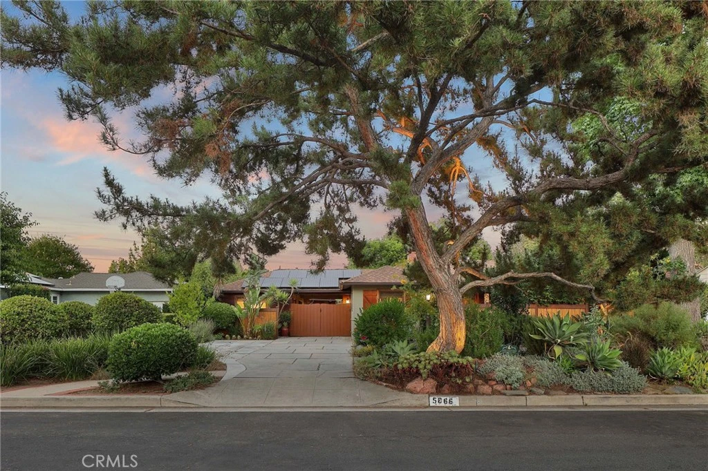 Located in sought-after Hillview Park Estates, this versatile 2,566 sq ft home on a .28-acre lot blends charm and function. It offers 4 bedrooms and 4 bathrooms, the fourth bedroom being a private guest suite with a separate entrance and kitchenette—ideal for multi-generational living. Energy-efficient with a fully owned 42-panel solar system, the home features a bright, updated kitchen with stainless steel appliances, built-in BBQ, and connects to a formal dining room with built-in cabinetry and a large garden window. The step-down living room boasts a wood-burning fireplace, in-wall surround sound, and opens to a sunny adjacent sunroom.The tranquil master wing includes high ceilings, French doors, a custom birchwood walk-in closet, and a spa-like bathroom with jacuzzi tub. A second suite offers another walk-in closet and updated bath.Perfect for entertaining, the finished garage opens via glass bi-fold doors to a resort style pool with a baja shelf and jacuzzi. A rare California basement adds space for a wine cellar or storage.The lush gardens include a fruit tree grove—pomegranate, blood orange, Meyer lemon, Persian lime, and more—alongside a seasonal potager garden with berries and vegetables. Landscaped with low-water native and Mediterranean plants, the grounds offer beauty and sustainability. Additional features include an enclosed carport with NACS EV charger and a double-wide driveway.