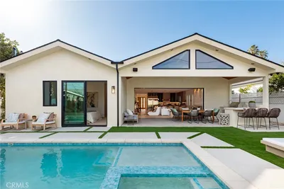 Introducing a brilliant newly constructed contemporary farmhouse situated in a prime Valley Village neighborhood. Tucked at the end of a quiet cul-de-sac street, this magnificent home is highlighted by its grand open living spaces, vaulted ceilings, custom woodwork, white oak doors and stunning designer finishes. Appointed with a spectacular chef's kitchen, anchored by its grand breakfast bar center island, waterfall countertops, custom cabinetry, large walk-in pantry and culinary styled Thermador appliances. A downstairs ensuite bedroom is prefect for a guest room. Upstairs you will find four generously sized ensuite bedrooms plus a sumptuous primary retreat that consists of a large walk-in closet, vaulted ceilings and spa-like bathroom that boasts a large walk-in shower, soaking tub and dual vanities. The amazing open flowing floor plan features a designated office in addition to the expansive family with sliding door panels creating a seamless indoor /outdoor experience. Step out and entertain with style in the private backyard, highlighted by its sparkling pool & spa, cozy firepit lounge area and professional outdoor BBQ area. In addition to the 2 car attached garage a large enclosed and gated front yard area is perfect for creating a playground, sports court or vegetable garden. You don't want to miss this Masterpiece with its A plus location.