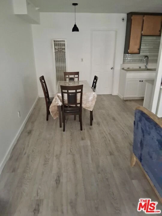 First floor condo in Los Angeles. The kitchen leads into an open concept living and dinning space. Private bedroom with balcony. The bathroom has a tub and single vanity. Assigned covered parking spot. Onsite washer/dryer. Water included in rent.