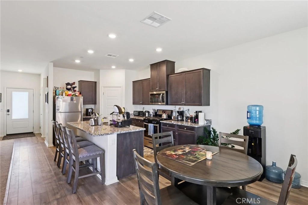 OWNED solar system and a modern single-story design! This newer home combines energy efficiency with stylish upgrades, including LVP flooring, stainless steel appliances, granite counters in kitchen and baths, and rich mocha-stained cabinetry. The open layout seamlessly connects the living, kitchen, and dining areas, creating the perfect space for everyday living and entertaining. The large kitchen boasts a center island with bar seating, pantry, and abundant cabinetry. A BONUS ROOM/office or optional 5th bedroom provides flexibility for work or guests. The primary suite is privately situated, featuring a walk-in closet and en suite bathroom with granite countertops. Additional highlights include well-sized bedrooms, a direct-access 2-car garage, and a spacious backyard ready for your personal touch. The hardscaped front yard with drought-tolerant plants adds curb appeal while keeping maintenance low. Conveniently located near schools, shopping, dining, and Sunset Ridge Park with easy access to Hwy 395 and the 15 freeway, this home is move-in ready.