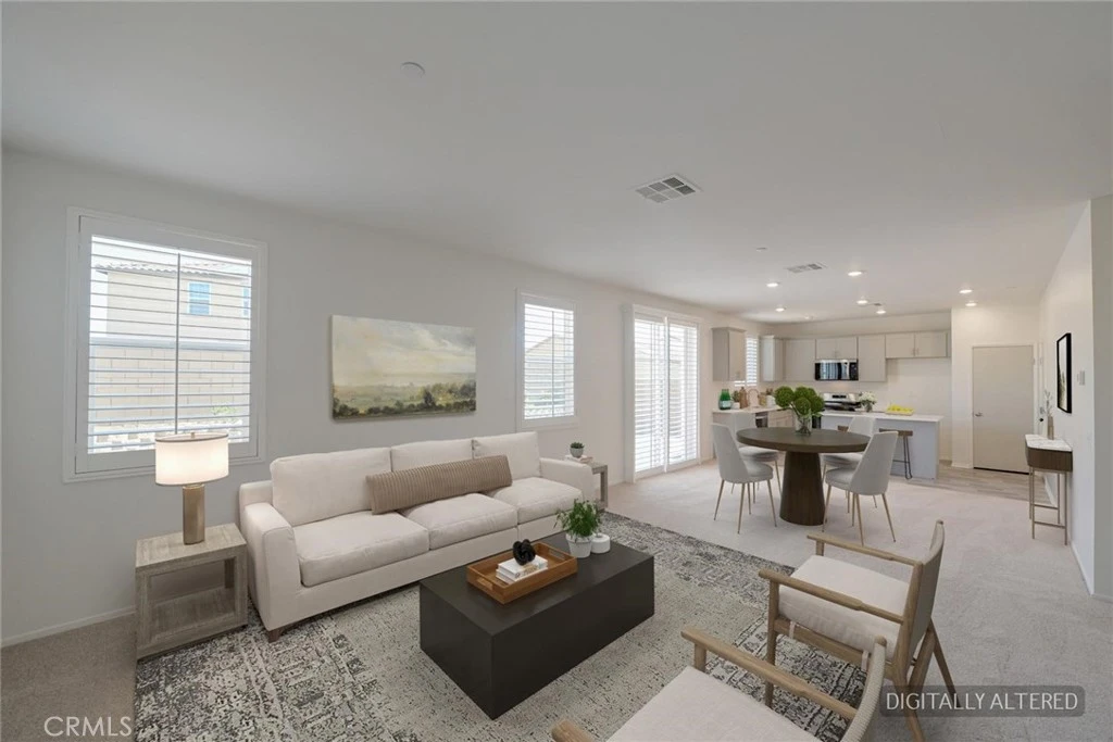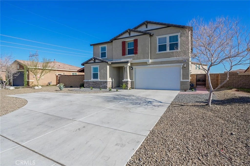 4BR/3BA home in Falcon Ridge in Victorville. Open floor plan with loft and main-level bedroom. Built 2020 with a 2-car garage. Located in the Falcon Ridge neighborhood of Victorville, this 4 bedroom, 3 bathroom single family home offers 2,217 square feet of living space on a 7,213 square foot lot. Built in 2020, the two story layout includes a main level bedroom and full bathroom, a feature many buyers look for when hosting guests, creating a home office, or accommodating multi generational living. The main level features an open floor plan that connects the living, dining, and kitchen areas into one functional space. The kitchen includes stainless steel appliances, a pantry, and generous cabinet storage. The layout keeps the kitchen open to the living areas, making it easier to stay connected while cooking or entertaining. Flooring throughout the home includes luxury vinyl plank and carpet. Upstairs you will find a versatile loft that can function as a second living room, media area, workspace, or game room. The primary suite includes a walk in closet and a dual sink vanity. Two additional bedrooms and another full bathroom are also located on the second floor. The indoor laundry area adds everyday convenience. The backyard is enclosed with a block wall fence and includes a covered patio that creates a shaded outdoor area for relaxing or dining outside with a built in BBQ station and a fire pit. The lot size of 7,213 square feet provides usable outdoor space while remaining manageable for maintenance. A two car garage offers additional parking, storage, or hobby space.