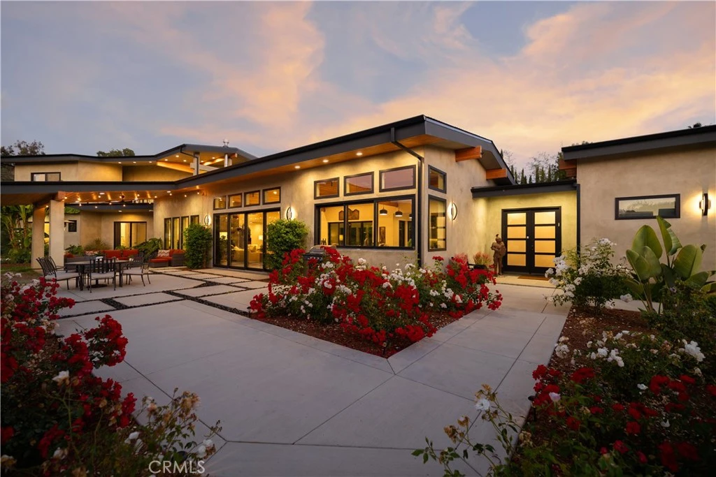 Discover the perfect blend of refined living and peaceful seclusion in this extraordinary 4,122 sq. ft. custom estate. Designed with clean architectural lines and expansive glass features, the home is bathed in natural light and offers captivating views from every room. Enjoy the ultimate in indoor-outdoor living with an open-concept layout, where expansive La Cantina doors seamlessly extend the main living area to the pool and entertainment spaces. The airy floor plan features soaring wood-beamed ceilings and modern finishes throughout. The heart of the home is the chef-inspired custom kitchen, complete with quartz countertops, an oversized island with prep sink, soft-close cabinetry, under-cabinet lighting, and premium appliances—including a gas range with convection, griddle, and combination steam oven. The main level also features a spacious great room with a stone fireplace, a media room, a half bath, and Jack-and-Jill bedrooms—each with private entrances and patios overlooking the pool. Upstairs, the primary bedroom offers an en-suite bath with a soaking tub, walk in shower and bidet, as well as a private office. Both the bedroom and office include private entrances and patios. This ENERGY-EFFICIENT and FIRE RESISTANT home features Energy Star Appliances, tempered double-paned glass windows, Indoor fire sprinkler system in every room, fire resistant stucco exterior and Class A fire rated roofing materials. The professionally designed drought tolerant landscaping hosts native plants, olive trees and fruit trees including avocado, lime, lemon, orange, tangerine, kumquat, 3 types of apple, mango, plum, Pakistani Mulberry and passion fruit vines. Located across the ravine from the main home, you’ll find a striking multi-use geodesic dome which offers a fully self-contained space, complete with full bathroom, kitchenette and washer/dryer hookup, making it ideal for a teen game room, guest quarters, an art studio, a private retreat or an office. 4 underdeveloped acres across the ravine offer exceptional potential in a high-demand market. Ideal for ADUs, equestrian facilities, rental income or future development. A rare opportunity to expand or invest. This is a MUST SEE property. Other notables: Private $100,000 well supporting High-Efficiency Timed Irrigation System Owned Solar On Demand Tankless Water Heater Water filtration System High Performance Septic System Zoned High-Efficiency Heat Pump System 2 EV Charging Stations