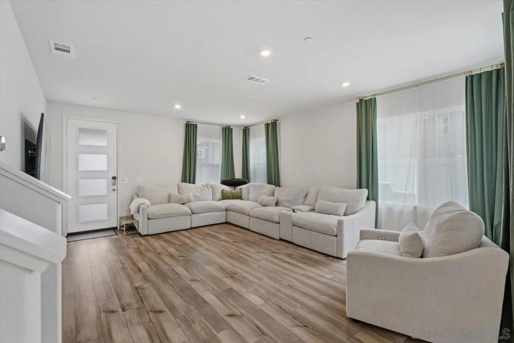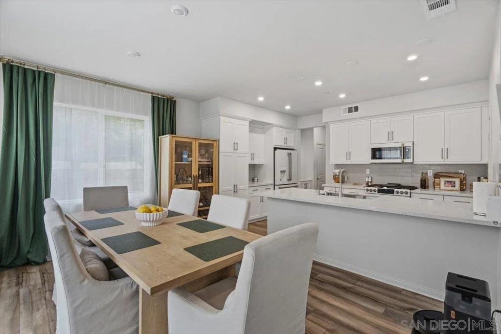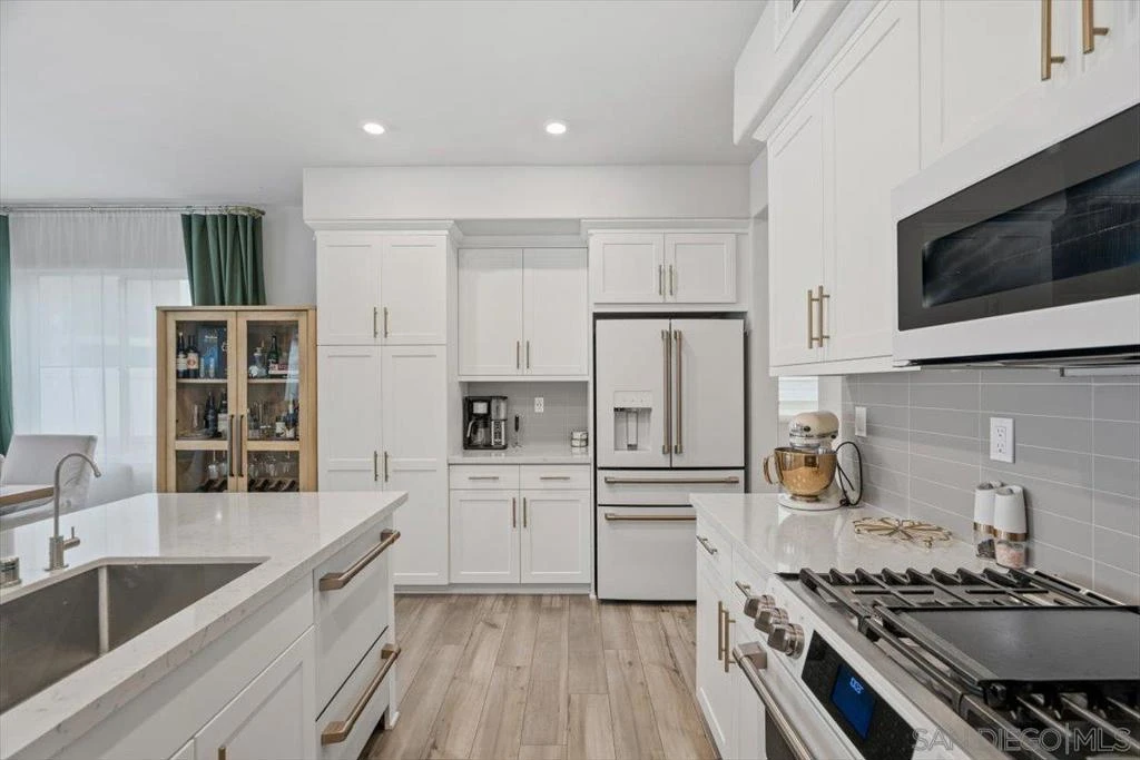 Beautifully upgraded home featuring a modern kitchen with quartz countertops, full backsplash, breakfast bar, walk-in pantry, and shaker-style white cabinets with brushed nickel hardware, luxury vinyl plank flooring, premium Cafe kitchen appliances including a dual oven and enhanced electrical. The charming farmhouse-style exterior offers great curb appeal. Enjoy a 2-car staggered garage plus driveway parking, conduit for a future EV charger, and an energy-efficient tankless water heater. Smart home features consist of Qolsys IQ panel, Ecobee thermostat, Eero router entry and a Schlage keyless. HOA maintains front yards, and NO Mello-Roos adds exceptional value.