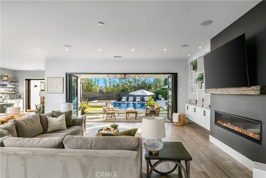 Located in the foothills of Vista, this exceptional fully custom, single-story Spanish-Modern estate is a true showplace, offering rare privacy, space, and turnkey living. Set behind a private gated entry on a fully usable half-acre, this estate-style property delivers the kind of single-level lifestyle that is increasingly difficult to find in North County San Diego. Designed for seamless indoor-outdoor living, the home features five bedrooms and four bathrooms with an open-concept great room layout. Approximately 40 feet of expansive modular glass doors open from the great room, dining area, and primary suite to covered patios and a resort-style backyard, creating effortless flow for everyday living and entertaining. The chef’s kitchen is fully custom with soft-close cabinetry, pull-out drawers, a 12-foot island, dual sinks, and a professional Thermador appliance suite. A walk-in pantry with custom shelving and barn door adds both style and functionality. The spacious primary suite serves as a private retreat with direct access to the pool and spa through a glass bi-fold door, electric privacy shade, and a barn door separating the bedroom from the spa-inspired bath. The primary bathroom features a freestanding soaking tub, marble shower, and custom cabinetry. Interior finishes throughout include hardwood flooring, built-in cabinetry, a modern glass fireplace with vintage timber mantel, Hunter Douglas Roman blinds, and cohesive matte black and brass hardware. Outdoor living is equally impressive, with a resort-style pool featuring a Baja shelf, spa, covered patio with decorative chandelier, and a fully developed outdoor kitchen with built-in BBQ. The backyard offers a quiet, private environment designed for entertaining without close neighbor proximity. Additional highlights include paid-off solar (33 panels), dual HVAC systems, tankless water heater, whole-house central vacuum, integrated interior/exterior audio, private gate with call box connected to cell phone, oversized three-car garage with attic storage, RV parking option, and an expansive driveway accommodating up to nine vehicles. A rare opportunity to own a fully custom, single-story estate combining craftsmanship, lifestyle, and privacy—without compromise.