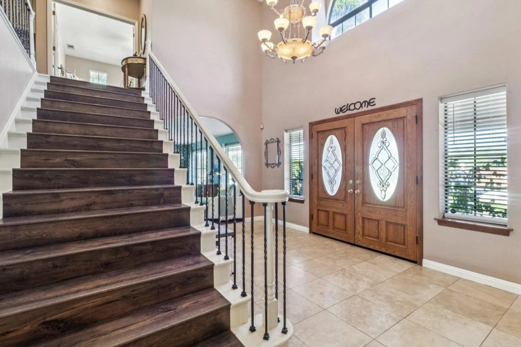 Welcome to this amazing Equestrian Estate! Boasting an elegant 4,100 square feet, this beautifully appointed and meticulously maintained home features a flowing floor plan with a bedroom and full bath downstairs, plus three additional bedrooms, two baths, an office, and a huge bonus room upstairs. The gourmet kitchen features granite countertops, a large island and tons of cabinet space. Additional touches include imported Alabaster chandeliers in the entry and dining room, travertine and luxury vinyl plank flooring, and tasteful upgrades throughout! Two separate offices offer the flexibility for remote work, creative space, or use for guests. The huge bonus/theater room is designed for fun and entertaining with a pool table and built-in bar. More features include a large master suite with dual walk-in closets, central vacuum system, ADT security, dual A/C, Solar, expansive pasture and mountain views, 3-car garage, carport, RV and horse trailer parking, 3 storage sheds and a chicken coop. Relax in the lush tropical private backyard with an inground solar heated pool and a Cal Spa fitness spa/hot tub. Horse facilities include a 4-stall breezeway barn with electricity, water and surveillance cameras, expansive pasture/turnout area, a large sand riding arena, and two additional 12x12 box stalls, one with a large corral attached. Fully fenced with a private gate and entry, the home is centrally located in the beautiful Gopher Canyon area of Vista/Bonsall, known for its mild Mediterranean climate. This rare property combines refined living, privacy and exceptional horse facilities for ultimate country living in style.