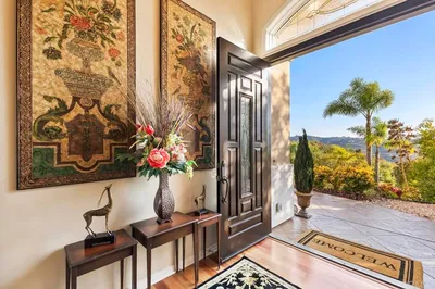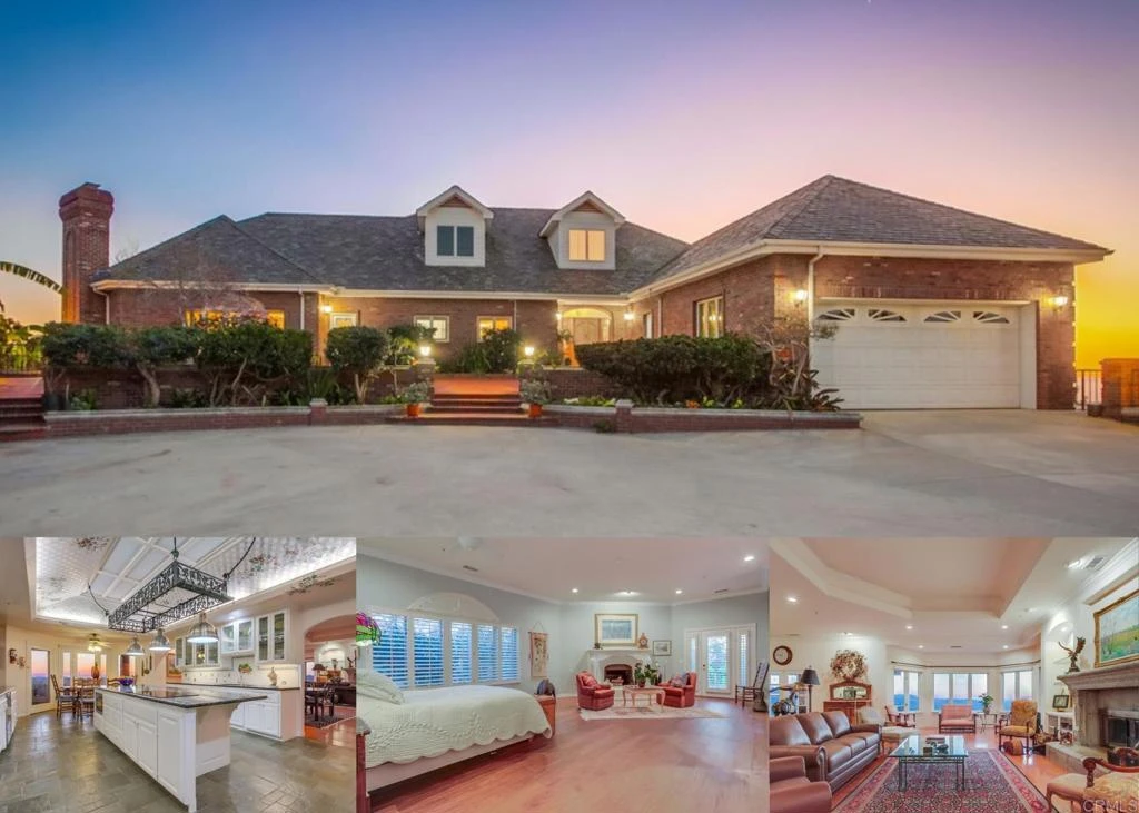 Indulge in unparalleled privacy and elegance from this luxury custom-built hilltop estate, perched atop 9.5 acres with breathtaking 360° views stretching from Big Bear Mountain to the ocean. An expansive brick veranda leads to the grand double-door entry, welcoming you into this 4,428 sq. ft. custom residence, where slate tile and hardwood floors guide you through a thoughtfully designed layout that highlights panoramic views from every room. The chef’s kitchen is a masterpiece, boasting a broad center island, gas and electric stove, double ovens, a Sub-Zero refrigerator, ample cabinet space with under cabinet lighting and trey ceiling backlights, a butler’s pantry, and a charming breakfast nook with doors opening to a serene outdoor patio. The primary suite, privately nestled in its own wing, is a retreat unto itself, featuring a spacious sitting area with a statement fireplace, a private patio entrance, and a luxurious ensuite bathroom complete with dual sinks, a soaking tub, a walk-in shower, and an oversized walk-in closet. Two additional private bedroom suites each offer their own ensuite bathrooms. The grand living room featuring a captivating fireplace, trey ceilings, and expansive windows that frame the stunning scenery. The formal dining room provides an elegant setting for gatherings, while the spacious family room offers a warm and inviting space to relax. This estate is equipped with modern conveniences, including fully paid solar, a Tesla charging station in the attached 2-car garage. Beyond the main residence, an 800 sq. ft. guest house provides additional living space with beautiful wood-beamed ceilings, a private patio, and a separate yard—perfect for visitors, a home office, or an income opportunity. A second 2-car garage and workshop offer extra storage and functionality. Designed for entertaining, the expansive outdoor patios feature a wood-fired pizza oven, a firepit, and breathtaking sunrise and sunset views. The lush grounds are dotted with producing fruit trees, including avocado, banana, passion fruit, loquat, kumquat, macadamia, dragon fruit, citrus, and cherimoya trees—creating a true private orchard. For golf and resort lovers, The Havens Country Club is just minutes away. This extraordinary estate offers the perfect blend of luxury, serenity, and breathtaking views—an opportunity not to be missed!