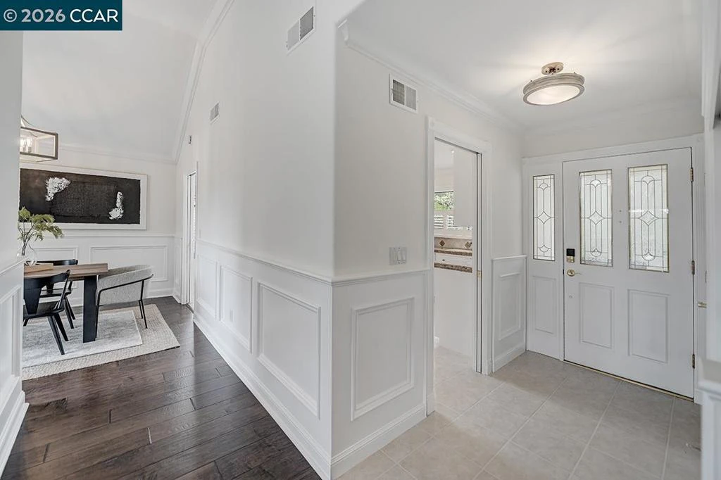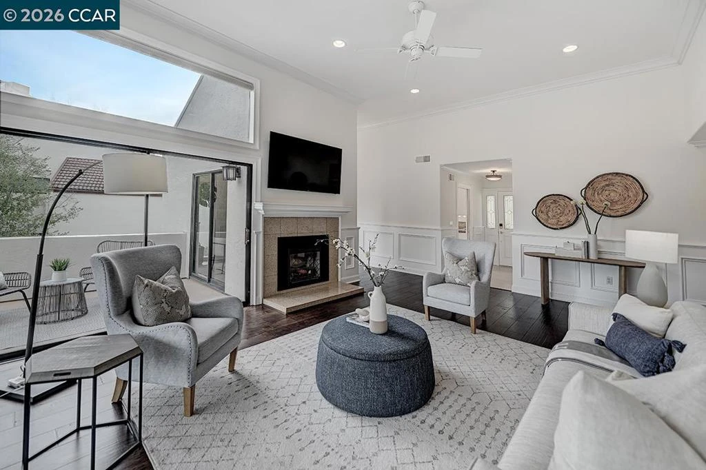 Tucked into a peaceful, tree-lined setting in Rossmoor, this sought-after Villa Verde model offers privacy, light, and style. Featuring 2 bedrooms, 2 baths, and a finished loft/den, the open floor plan is filled with natural light from oversized windows and tranquil hillside views. Enjoy seamless indoor-outdoor living on the expansive deck surrounded by mature trees—ideal for morning coffee, sunset wine, or entertaining guests. Designer touches include high ceilings, hardwood floors, new carpet, wainscoting, crown molding, and updated lighting and fixtures throughout. The eat-in kitchen features white cabinetry, granite countertops, a stainless refrigerator, white appliances, and plantation shutters framing serene views. The living room offers an electric fireplace and mounted flat-screen TV, creating a warm, inviting space to gather. The primary suite includes a walk-in closet and ensuite bath with soaking tub and double-sink vanity. The guest bedroom opens directly to the deck, perfect for visitors. A finished loft w/built-in desk, serviced by central H/A is ideal for a home office or flex space. In-home laundry & attached painted garage w/ epoxy floor complete this move-in-ready retreat.