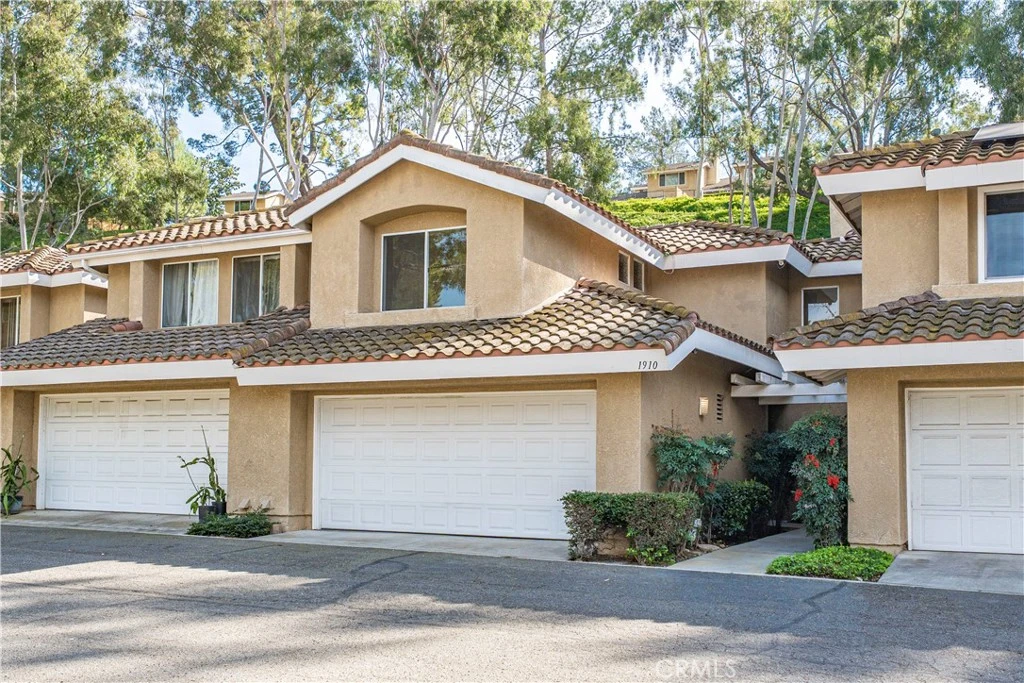 This two-story condominium with 2 primary bedrooms, 2.5 bathrooms offers 1,488 square feet with high ceilings and an open floor plan. Living room features a gas fireplace and direct sliding door access to the private patio. Dining area connects to the kitchen through a breakfast bar opening. Remodeled kitchen includes quartz countertops, white cabinetry, recessed lighting, built-in microwave and dishwasher. All bedrooms are located upstairs. Primary suite includes vaulted ceiling, and en-suite bathroom with walk-in shower. Second bedroom features vaulted ceiling and access to a full bathroom with tub/shower combination. Remodeled powder room on the main level. Interior updates include fresh paint, new carpet, recessed lighting, and central air conditioning. Private fenced patio includes Trex decking and backs to a landscaped hillside with no rear neighbor. Two-car attached garage provides direct interior access. Monterra Pointe community amenities include pool and spa with surrounding deck and lounge areas. Convenient access to nearby shopping, dining, parks, and freeway corridors.