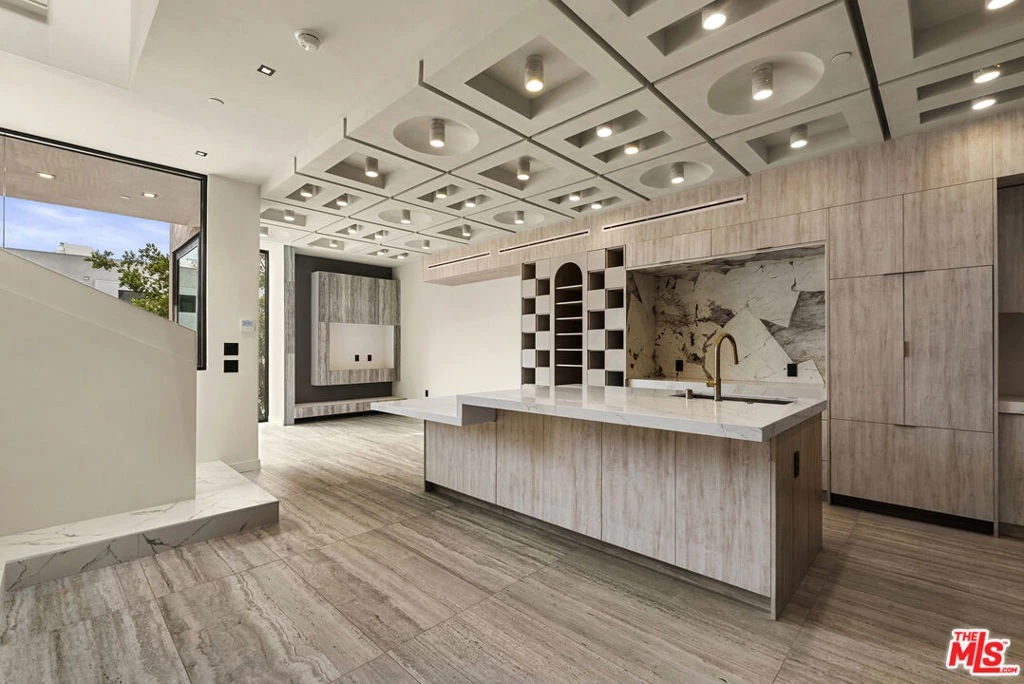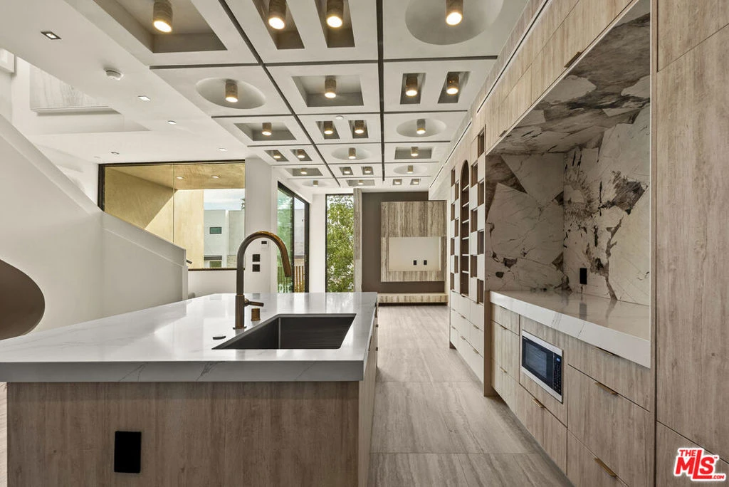 Welcome to The Dolomia Niche, a one of one architectural residence. A never before lived in two bedroom, 2.5 bath penthouse home within the newly completed Limited Edition building, defined by a serene European stone palette, sculptural architectural detailing, and integrated modern functionality rarely found in lease offerings. The main living environment is anchored by the building's signature coffered ceiling with warm bronze lighting and a refined chef's kitchen wrapped in bespoke European cabinetry from Italy and Spain. Quartz countertops and large-format stone surfaces create a calm, gallery like material continuity throughout. Expansive sliding glass doors extend the residence to a 129 sqft private terrace. A sculptural interior staircase ascends to the private upper level where both bedrooms are positioned, establishing a rare two level penthouse layout. Walls are finished in ceramic and floors in porcelain, with the majority of tile selections sourced from premier manufacturers in Italy, Spain, and the United Kingdom. A defining architectural feature of the residence is the custom sculpted niche, a one of a kind built in retreat designed as a media alcove, reading lounge, or creative workspace. This signature moment introduces a sense of depth, personality, and spatial sculpture unique to this home within the Limited Edition collection. The primary suite is paired with a spa bath finished in large-format European tile from the Dolomia and Dehor collections, arranged in a geometric stone composition with warm neutral tones, floating double vanity, and modern matte black fixtures. Secondary baths continue the same refined material language with sculptural lighting and clean architectural lines. Residents also enjoy access to a landscaped rooftop retreat featuring sculptural desert plantings including golden barrel cactus, San Pedro cactus, prickly pear, aloe varieties, and flowering planters, an elevated communal lounge framed by sky and city outlooks. Delivered brand new, The Dolomia Niche represents a level of architectural leasing product not previously introduced to this West Hollywood pocket. A collectible residence within the Limited Edition development defined by bespoke design, European materials, and sculptural living.