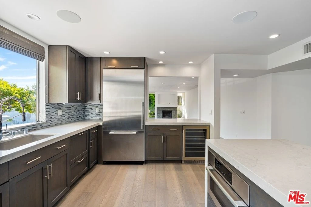 Stylish West Hollywood corner condo located just off the Sunset Strip and adjacent to Beverly Hills. This residence has high-quality finishes and a cohesive, modern color palette throughout. Light and bright living and dining areas feature a fireplace, walls of glass, and direct access to a wrap-around balcony with treetop and city views. The kitchen offers stainless steel appliances, including a wine refrigerator, center island with breakfast bar and storage, soft-close cabinetry, and an enlarged pass-through ideal for entertaining. The primary suite includes a fireplace, custom walk-in closet, and access to a private balcony. Modern bathrooms showcase contemporary finishes and thoughtful design. This home offers comfortable, turnkey living in a prime West Hollywood location.