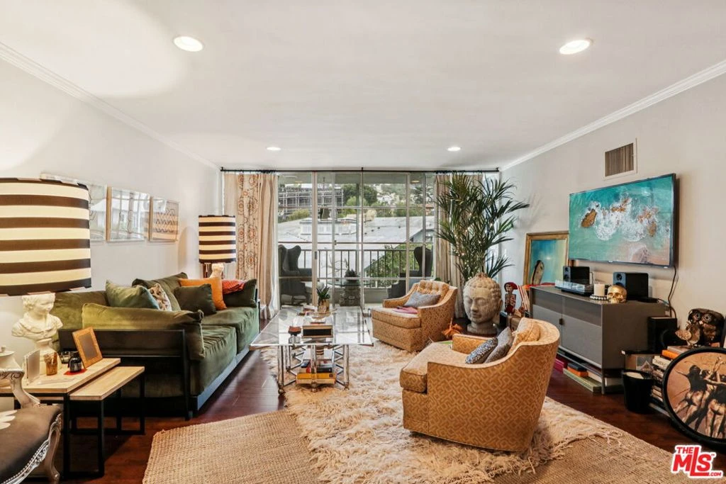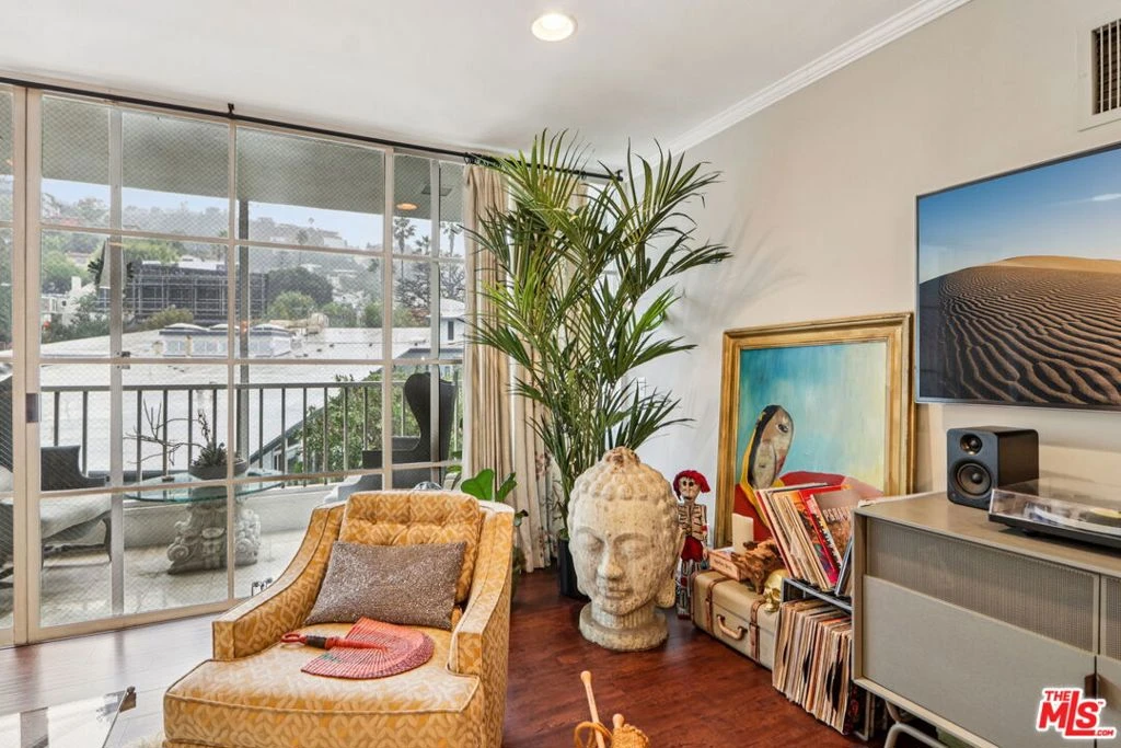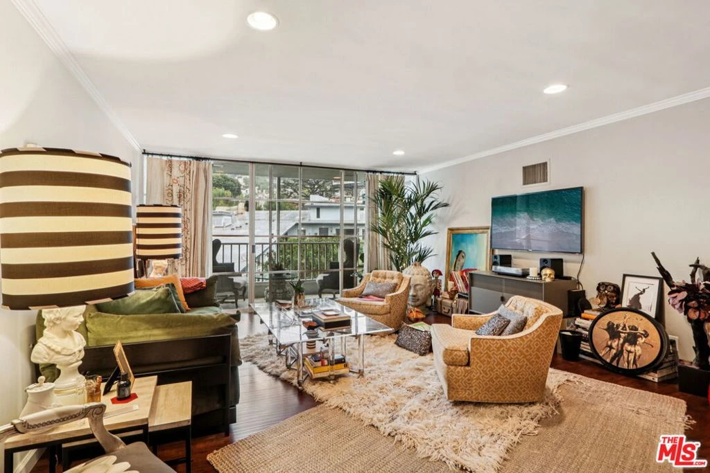 This top floor, two-bedroom condo in West Hollywood's iconic Sunset Penthouse building offers unbeatable views and classic mid-century modern style by renowned architect Frank P. Schneider. Located just below Sunset Boulevard, the Northeast corner unit sits beside the elevator, creating the feel of a private lift delivering you directly into your penthouse retreat. Inside, a bright open floor plan with high ceilings and hardwood floors feature a dramatic floor-to-ceiling glass wall that opens to a large private balcony with sweeping Hollywood Hills views. The spacious living and dining areas, complete with a wet bar and chef's kitchen, are ideal for entertaining, while additional highlights include recessed lighting, central heating and air conditioning, washer/dryer hookups, two side-by-side covered parking spaces, extra storage, and access to a rooftop terrace with panoramic 360-degree views perfect for sunset gatherings on the sundeck. Priced under $1 million, this home presents an exceptional opportunity for first-time buyers to enter the market in style, with prime walkability to the Sunset Strip, La Cienega, and Santa Monica Boulevard, Saddle Ranch, Sunset Tower Hotel, THE PUBLIC (formerly known as The Standard), The Comedy Store, just blocks from top restaurants and nightlife. William S. Hart Park and Off-Leash Dog Park offers a peaceful, tree-lined retreat on the former estate of silent-film star William S. Hart, providing a charming neighborhood oasis for residents and their pets while remaining close to the Sunset Tower Hotel and the heart of West Hollywood. Walk score 97!!!!