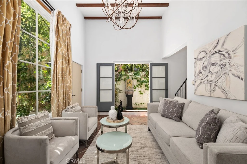 This townhome has bonus room with private entrance... easily making it a 2 bedroom unit. Tucked within the coveted and award winning 7 Fountains—a gated enclave of just 20 architecturally significant Spanish Revival villas by Stefanos Polyzoides—this rare end-unit townhome offers luxury, privacy, and timeless design in the heart of West Hollywood. With soaring ceilings, exquisite finishes, and multiple private outdoor spaces, this sophisticated residence is a true lifestyle offering. A formal entry leads to an expansive living room featuring dramatic exposed beams, a wood-burning fireplace, and oversized French doors opening to a lush private patio—perfect for entertaining or quiet evenings under the stars. The remodeled chef’s kitchen is outfitted with Viking appliances, a farmhouse sink, marble counters, and designer hardware, seamlessly connected to a dining area with built-in bar, China cabinet, and Juliet balcony. Upstairs, the primary suite exudes romance with vaulted ceilings, dual custom closets, and a spa-inspired bath complete with marble countertops, dual vessel sinks, and a glass-enclosed steam shower. A private balcony offers a serene perch above the gardens below. A versatile bonus room with its own private entrance offers the ideal setup for a second bedroom, creative studio, or home office—making this home as functional as it is beautiful. One of the few units in the complex with direct access to a private two-car garage, this townhome also boasts two patios, rich architectural detailing, and an abundance of natural light throughout. Residents of 7 Fountains enjoy lush courtyards with koi ponds, hand-painted tile fountains, an outdoor fireplace, reading lounge, and an oversized spa—offering resort-style serenity just moments from the vibrant energy of Sunset and Santa Monica Boulevards. This is a rare opportunity to own a residence that blends historic inspiration with modern refinement, in one of the most sought-after communities in Los Angeles.