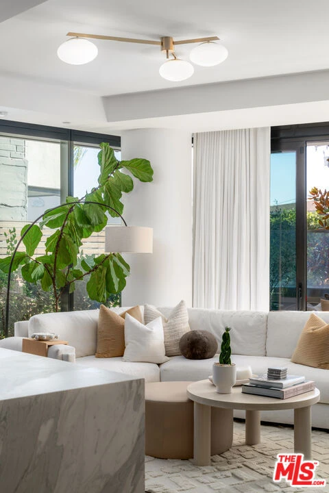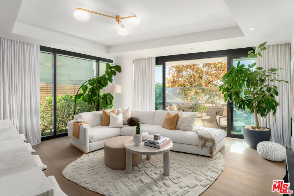 Residence 107 at The Sun Rose presents a rare opportunity along the iconic Sunset Strip, blending contemporary design with the effortless luxury of a premier full-service address. Floor-to-ceiling glass fills the interiors with natural light, highlighting wide-plank white oak floors and a seamless open layout tailored for both sophisticated entertaining and relaxed everyday living. The bespoke kitchen is outfitted with Sub-Zero and Wolf appliances, custom stained oak cabinetry, Waterworks fixtures, and a striking Calacatta Borghini marble island, while the primary suite offers a private retreat complete with a tailored Poliform dressing room and spa-inspired marble bath. A secondary en-suite bedroom, refined powder room, dedicated laundry, integrated audio, private elevator access, and two side-by-side parking spaces with EV charging enhance the residence, complemented by 24-hour concierge and security, valet, rooftop pool, fitness center, garden terrace, resident lounge, and exclusive access to The Sun Rose's signature hospitality amenities.