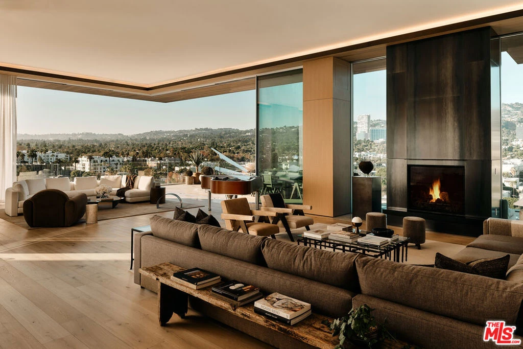 Introducing Penthouse West at 8899 Beverly - the largest top-floor residence in this Olson Kundig-designed architectural masterpiece in West Hollywood's Design District. This sprawling 7,303-square-foot penthouse is an art collectors dream. Experience full-service, luxury living with 4 bedrooms, 5 full bathrooms, 2 powder rooms, and a versatile media room set up as private office space apart from the main residence living areas. Designed to impress, the Penthouse features a great room with soaring 14-foot floor-to-ceiling motorized Vitrocsa glass walls that open to a 1,900-square-foot wraparound terrace with breathtaking, panoramic views of the Hollywood Hills and Los Angeles skyline. The gourmet kitchen pairs functionality with artistry, boasting Calacatta gold marble countertops, custom white oak cabinetry, and premium appliances by Gaggenau, Miele, and Subzero. A separate butler's kitchen and discreet service entrance enhance the penthouse's hosting capabilities, ideal for entertaining at scale or enjoying intimate gatherings. The expansive primary suite, a private sanctuary over 1,000 square feet, includes dual walk-in closets, luxurious dual bathrooms, and direct access to the terrace, offering uninterrupted views of the Hollywood hills. The three guest bedrooms feature ensuite bath and stunning south-facing views, providing the utmost privacy and comfort. For the car aficionado, Penthouse West features a private four-car autostable behind bespoke enclosed doors, plus two additional valet spaces, accommodating up to six vehicles. A private and discreet Penthouse lobby in the garage offers direct elevator access to the top floor. Exclusive resident amenities elevate the experience further, with a resort-style pool, outdoor kitchen, fireplace gardens, fitness center, and yoga studio. Situated in the heart of the West Hollywood Design District, this penthouse boasts a Walk Score of 92, with Bristol Farms, high-end dining, designer boutiques, and entertainment just steps away, delivering an unparalleled lifestyle in one of LA's most coveted and walkable neighborhoods.