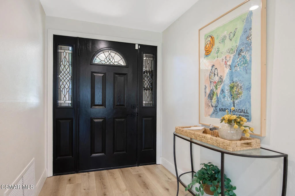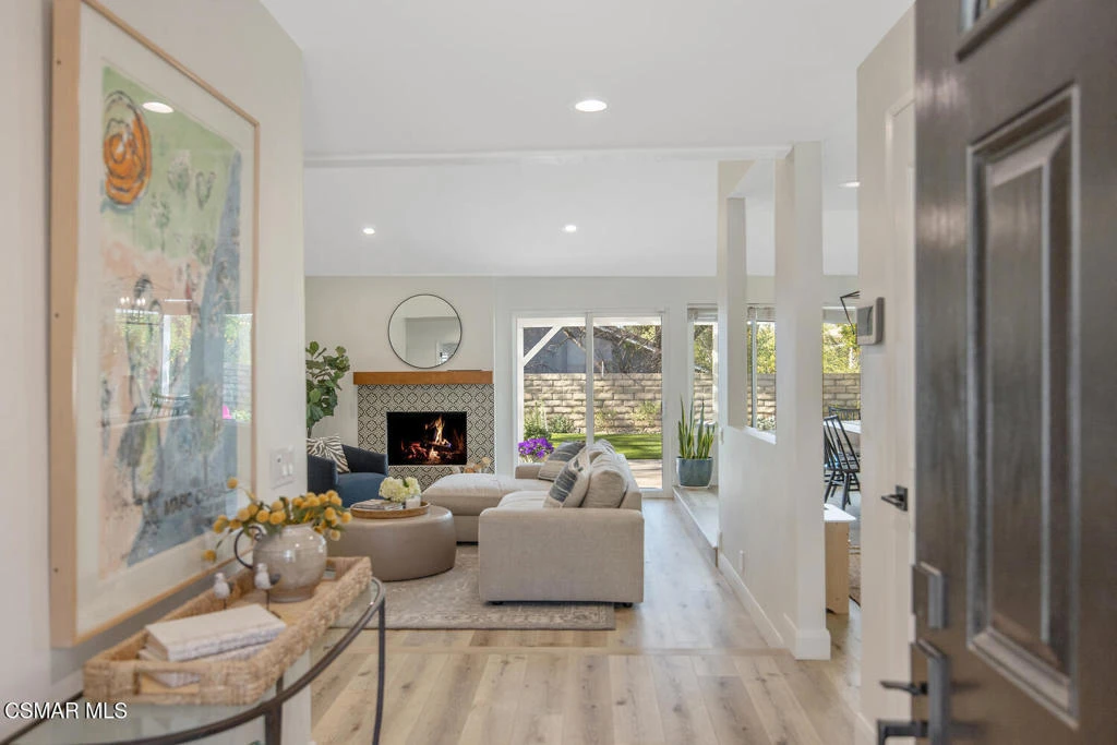 Welcome to this fully updated single-story home located in the highly desirable Westlake Hills neighborhood. With tons of natural light, the open-concept layout features soaring high ceilings, an expanded kitchen, recessed lighting, a gorgeous fireplace with custom tile work, and newer wide plank designer flooring. This bright and welcoming atmosphere is ideal for both everyday living and entertaining. Step outside to the extraordinarily spacious and peaceful backyard with lovely mountain and tree views, new easy-care turfed landscaping and drip irrigation, mature fruit trees, large patio, a cozy newly paved fire pit deck and a dedicated dog run. This backyard has amazing sunset views and provides privacy and serenity perfect for relaxing evenings or gatherings with friends and family. Both bathrooms have been tastefully updated, including a primary suite with an enlarged shower with bench seating and dual sinks. The second bedroom is enhanced with custom organization by California Closets, maximizing functionality and storage. Additional upgrades include a new HVAC system with updated ducting, new electrical panel, tankless water heater, newer double pane windows, a garage with epoxy floors, an EV charger, and a large overhead storage space with a pull-down ladder. TVs in the home are hardwired in the walls for optimal streaming performance. Situated in a convenient and coveted neighborhood in the heart of Westlake Village, with a low voluntary HOA, residents enjoy access to beautiful walking greenbelts for easy access to a top-rated elementary school, parks, restaurants, shopping, and nearby hiking trails. This turnkey home combines comfort, style, and an unbeatable location.