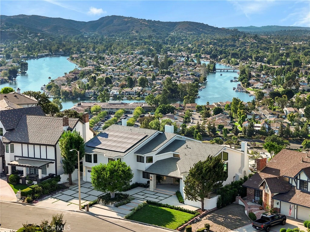 Experience elevated California living in this fully remodeled smart home with sweeping lake views in one of Westlake Village’s most desirable neighborhoods. Seamlessly blending timeless elegance with cutting-edge technology, this residence showcases premium finishes, thoughtful design, and impressive attention to detail throughout. The expansive floor plan offers 4 spacious bedrooms, a dedicated office, bonus room, formal living and dining rooms, and a welcoming family room — ideal for both entertaining and everyday comfort. The custom chef’s kitchen features Taj Mahal marble countertops, high-end appliances, and refined cabinetry, creating a centerpiece worthy of a magazine spread. Sophisticated touches include Italian tile in the bathrooms, LED accent lighting in the bathrooms and staircases, custom interior doors, and three fireplaces for added warmth and ambiance. A sleek wet bar adds effortless functionality for hosting guests. The home is equipped with dual A/C units for zoned climate control and long-term comfort. The luxurious primary suite features a spa-inspired bathroom and a private balcony with serene lake views — a perfect retreat for sunrise coffee or sunset wine. Step outside to a showstopping backyard designed for modern outdoor living. Enjoy a resort-style pool and spa featuring a baja shelf, crisp architectural hardscape, a vertical green wall, and a raised deck with panoramic views stretching across the lake and surrounding mountains. Mature fruit trees line the property, and the home is powered by fully paid-off solar panels, offering beauty, privacy, and efficiency. This turn-key home is a rare opportunity to own a fully upgraded lakeview estate in a premier Westlake Village setting — where luxury, location, and lifestyle come together effortlessly.