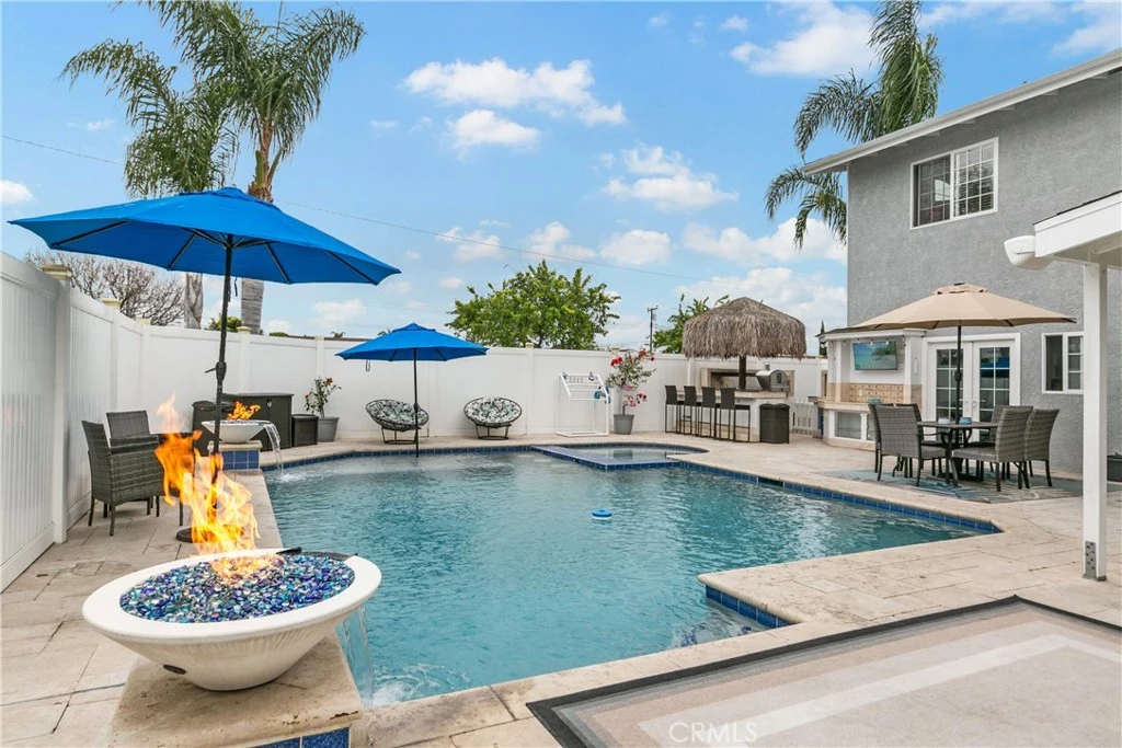 Nestled in beautiful Westside Westminster, this stunning residence offers an unparalleled blend of coastal charm and contemporary luxury. Situated on an oversized 7500 square foot corner lot and boasting 5 bedrooms and 3.5 baths spread across nearly 3000 square feet of interior living space, this home offers ample room for relaxation and entertaining. Upgrades include remodeled kitchen with quartz countertops and subway tile backsplash, newer paint, flooring, paneled walls, and a custom family room bar with a live edge/epoxy river top, and vaulted ceiling bonus room with overhead billiard lighting. Luxurious primary with en-suite bathroom with dual vanities and his and hers walk-in closets. Incredible backyard oasis comes complete with pebble tech pool/spa with Baja shelf, waterfall, fire features, “Katch-A-Kid” pool net, palapa covered outdoor bar/kitchen with built in BBQ, pizza oven, and recessed TV mount. Perfect interior tract location and just a short stroll to award wining Eastwood Elementary School and neighborhood Bolsa Chica Park.