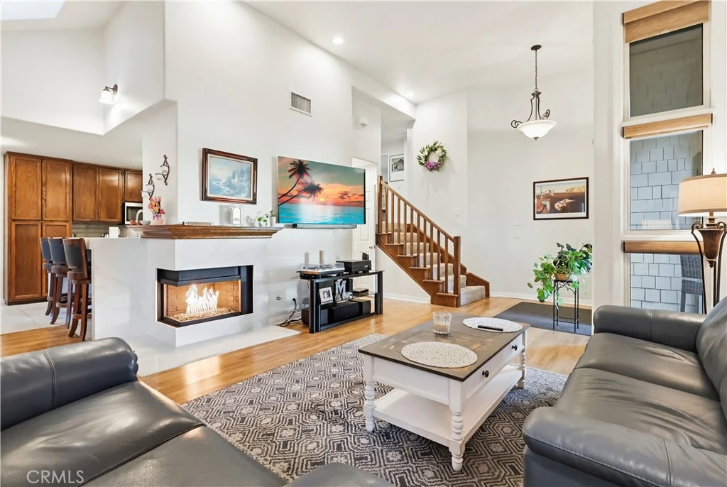 This beautifully maintained 2-bedroom, 2-bath split-level view home offers 1,356 square feet of comfortable living in a desirable gated community — now featuring a brand new HVAC system. Cathedral ceilings in both the living room and primary bedroom create an open, airy feel, while the west-facing orientation delivers breathtaking sunsets and sparkling city-light views each evening. The inviting living room features a cozy gas fireplace with modern glass rock accents, perfect for relaxing at the end of the day. The updated kitchen includes quartz countertops, stainless steel appliances, tile flooring, and custom window coverings. Warm wood flooring runs through the main living areas, with soft carpet in the bedrooms for comfort. The spacious primary suite offers a Jacuzzi soaking tub and separate walk-in shower, creating a relaxing retreat. A second full bathroom provides flexibility for guests or family. Additional highlights include indoor laundry, a 2-car attached garage with extra storage, and a full-size private patio (not a balcony) with direct gate access to the pool and walkway. Set among mature pine trees and beautifully landscaped grounds, the community offers a pool, two spas, ample guest parking, and nightly security patrol, creating a peaceful resort-like environment. Views, comfort, and convenience — all in one exceptional home.