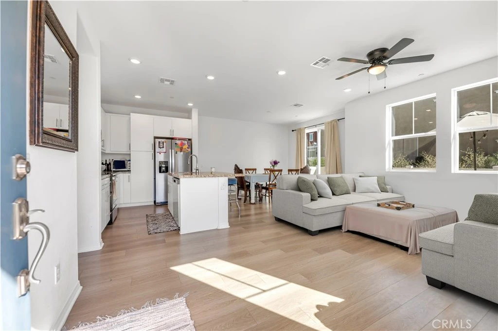 BEAUTIFULLY UPGRADED END-UNIT HOME WITH PAID OFF SOLAR IN THE ALLURING HORIZON PLACE COMMUNITY, OFFERING SCENIC HILL VIEWS AND NO REAR NEIGHBORS. This light and bright residence features 3 bedrooms plus a spacious loft and 2.25 bathrooms with soaring 9-foot ceilings and upgraded vinyl flooring. The open floor plan includes a large family room and dining area that flows seamlessly into the open kitchen with stainless steel appliances, granite countertops, center island with breakfast bar, and ample cabinetry. The expansive Primary Suite offers views and a private bathroom with dual sinks, step-in shower, linen storage, and a large walk-in closet. Spacious secondary bedrooms provide flexibility for guests, office, or hobbies. Additional features include a large 2-car garage with direct access, tankless water heater, paid solar system, ceiling fans, indoor laundry room with washer and dryer included, and a private patio courtyard. As a bonus, the home and carpets have been professionally cleaned and are move-in ready. HOA amenities include a pool, spa, firepit, BBQ area, playground, and manicured landscaping. Conveniently located near shopping, hospital, dining, and easy access to the 15 Freeway, making it ideal for commuters.