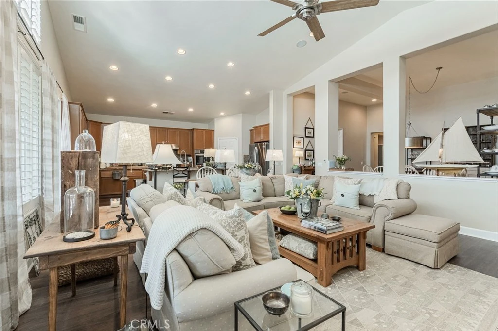 SINGLE STORY | VIEWS | NO REAR NEIGHBOR | 3 CAR TANDEM GARAGE | + OFFICE Talk about pride of ownership! This north-facing residence offers charming curb appeal right off the bat and truly stands out in the neighborhood. This 3bed, 3 full bath residence also has an office/den and comes in at 2,356sf of sophisticated living space. Leading off with a beautiful extra-wide front door and wide hallway that lures you right into a stunning open great room with soaring ceilings and lots of natural light pouring in from all over! The interior is defined by durable vinyl plank flooring, elegant plantation shutters, and a cozy wood-burning fireplace with a gas outlet for effortless ambiance. Culinary enthusiasts will gravitate toward the chef’s kitchen, which features premium Bosch appliances, a stainless farmhouse sink, and LED lighting that continues throughout the entire home. The expansive master suite serves as a private sanctuary, boasting a massive closet with custom organizers and a spa-like bathroom centered around an amazing soaking bathtub. Every room is wired for ceiling fans, including an extra-large fan already positioned in the central family gathering room. Outside, the property captures the magic of the region with clear views of the Palomar Observatory and the iconic sight of Temecula’s hot air balloons drifting by in the early morning light. The 35x14 covered courtyard patio provides a serene retreat within a backyard fully enclosed by block walls and featuring stacked block garden beds. Complete with a 3 car tandem garage, an automatic irrigation system, and timed landscape lighting in both the front and back, this home perfectly balances high-end amenities with low-maintenance California living. Conveniently located in a low tax and low HOA neighborhood, this home is close to all major shopping, restaurants, award winning schools and a short 2 min drive to the popular Abelia Sports Park!
