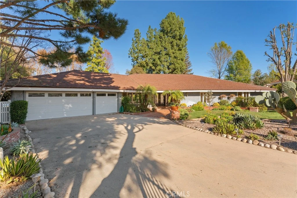 Sprawling single story approx. 4,000 SF gated estate located South of the Boulevard in desirable Vista De Oro at the very end of a quiet cul-de-sac on an almost 19,000 SF lot. The private property sits back from the street behind an automatic security gate & separate pedestrian access. Spacious front yard has rolling front lawn with drought resistant landscaping, mature trees, & long driveway that leads to the 3-car attached garage with built-in storage and direct access. A meandering brick pathway leads to the covered front porch with double door entry. Step inside to find a grand entry foyer with wood beamed tray ceiling, coat closet, & convenient guest powder bathroom. The formal living room has brick fireplace, wood product walls, crown moldings, & French doors that open to backyard. Separate family room features vaulted wood beamed tongue & groove ceiling, brick fireplace, built-in display & storage cabinetry, & French doors that open to the yard. Formal dining room has buffet counter with custom storage cabinetry, gorgeous parquet wood floors, and large picture windows overlooking the exterior. Chef’s upgraded kitchen features large center island, stainless appliances including Miele double ovens, Subzero refrigeration, Viking 6-burner stove + grill, two warming drawers, walk-in pantry, & separate breakfast room with built-in bench seating and expansive storage cabinetry & counter space. Grand primary suite boasts double door entry, French doors that open to the backyard, built-in storage, two oversized walk-in closets with custom built-ins, and luxurious en-suite upgraded bathroom with custom vanity, dual sinks, stone counters, separate makeup vanity, large walk-in shower with dual bench seats & raindrop shower head, & separate spa tub with jets. Attached to the primary is a massive bonus room providing ideal flex space for office/gym/5th bedroom featuring French doors that open to the yard, large walk-in closet, and built-in desks & storage. There are three additional secondary bedrooms, two share a large bathroom with walk-in shower and the third has its own bathroom with shower & tub. There is also a laundry room with storage and exterior access. The entertainer’s backyard boasts swimming pool with children’s safety gate, large covered pergola for outdoor dining, separate Saltillo tiled patio with BBQ center, and lush landscaping with grass lawns and fruit trees. Adjacent to Topanga Mall/Village, Warner Center, hiking trails & minutes to Malibu.