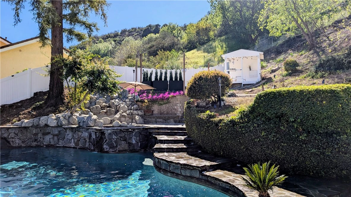 Tucked away on a quiet cul-de-sac south of Ventura Boulevard in the highly desirable Vista De Oro neighborhood of Woodland Hills, this move-in ready split-level home offers privacy, comfort, and resort-style indoor-outdoor living with pool, spa, fully paid solar, and no HOA. Surrounded by architecturally distinct homes and scenic hillside surroundings, the property features a light-filled open floor plan with soaring ceilings, wood and tile flooring, recessed lighting, and over $90,000 in upgrades. A welcoming entry opens to a vaulted living room with gas fireplace, expansive windows, and elegant light fixtures that fill the space with natural light. The kitchen features granite countertops, stainless steel appliances, a newer dishwasher, and travertine flooring. Sliding glass doors open directly to the backyard retreat, creating a seamless connection between indoor and outdoor living while providing a functional and stylish space for everyday living and entertaining. An oversized family room provides an additional gathering space with fireplace, recessed lighting, and French doors. Upstairs, the spacious primary suite offers a dual walk-in closets, a tiled shower, jetted soaking tub, dual vanities. French doors open to a private balcony overlooking the hillside, pool, and beautifully landscaped yard, adding to the sense of charm and tranquility. The backyard is designed for relaxation and entertaining, featuring a covered patio, multiple seating areas, built-in gas and charcoal barbecue, and a saltwater pool and spa with waterfall feature surrounded by mature landscaping. A charming outdoor playhouse adds character to the yard, and nearby the current owners have created an inviting outdoor movie projection area with a gas fire pit, offering a cozy setting for evening gatherings under the stars. Major upgrades include a 200-amp electrical panel, EV charger, and fully paid 10.05 kW solar system installed in 2020. The pool system has been extensively improved with a Hayward salt system, new filter, Pentair IntelliFlo variable-speed pump, Raypak heater, Jandy iAquaLink automation, and color-changing LED lighting. Additional improvements include an irrigation submeter, new side vinyl fencing, and newer washer and dryer. A rare chance to own an upgraded home in one of Woodland Hills’ most desirable neighborhoods with access to wonderful schools where comfort, privacy, and outdoor living come together in a setting best appreciated in person. 310.497.9202