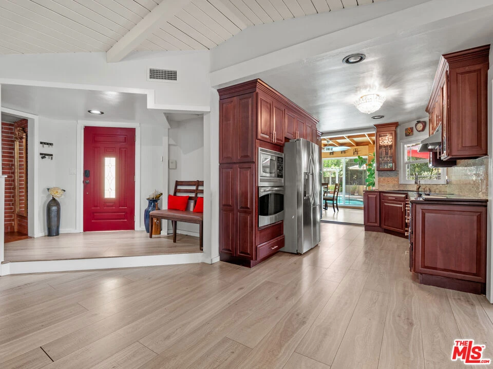 Welcome to this upgraded 4-bed, 2-bath entertainer's pool home in Woodland Hills, featuring stunning views and an electric gated entry. Step into the inviting foyer that leads to the family room, boasting an upgraded fireplace with a wood mantel, wood vaulted ceilings, upgraded flooring and a slider opening to the side yard. The living room flows into the dining area, both filled with natural light from numerous windows showcasing beautiful views. The kitchen is equipped with stainless steel appliances and stunning cabinets with pull-outs, granite counters with custom backsplash and a breakfast nook offering picturesque yard views and lots of storage. The first level also includes two bedrooms, a bathroom, and a laundry area. Upstairs, you'll find ample natural light, upgraded flooring, two additional bedrooms with walk-in closets, and a remodeled bathroom. The entertainer's yard features a built-in BBQ, replastered sparkling pool with newer tiles and saltwater chlorine generators, newer HVAC, pergola patio cover, pool house, waterproof decking, recently stucco exterior and abundant storage throughout the property. Close proximity to Malibu Beach, Commons in Calabasas, The Village in Topanga, Topanga Social, Ventura Blvd, shopping, restaurants, and more! This home has it all and is ready for its new owner to make it their home!