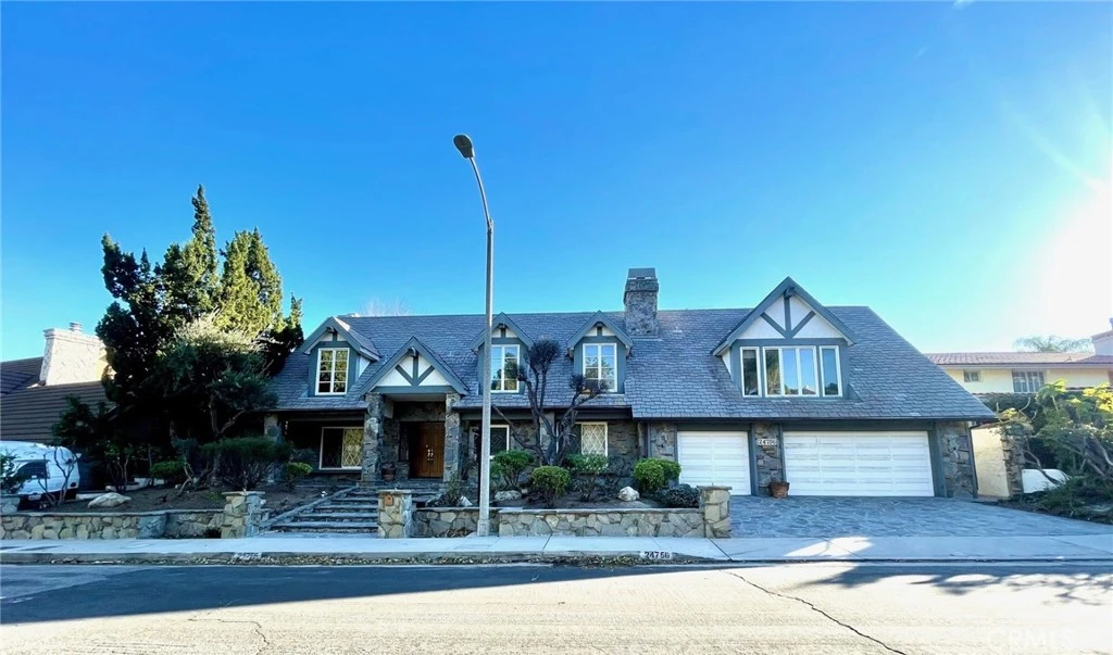 Custom built English Tudor in a highly sought after neighborhood of Woodland Hills. Situated on nearly 1/2 an acre, this home has 6 bedrooms, 5.5 bathrooms and nearly 5,200 square feet of living space. Double door entry opens to foyer with intricate mosaic stone floors. Light and bright living room with fireplace leads to formal dining room with French doors leading to backyard. Sun filled kitchen with grand center island, stainless steel appliances, built-in grill and breakfast nook with pass through opening to kitchen. Kitchen also overlooks large den/family room with stone fireplace. The lower level West Wing also features a a separate butler's pantry with washer/dryer hook-ups, wine closet, powder room with custom wall upholstery and a 6th bedroom with its own separate full bathroom. Upper level features master suite, four additional well-sized bedrooms and a large grand room. Upstairs master suite features high-beamed ceilings, large walk-in closet, double sided fireplace that looks into master bathroom with two vanity sinks, spa tub, a separate room with bidet and massive walk-in shower stall. Upper level also features an ensuite bedroom with its own bathroom and walk-in closet. Upper level West Wing provides for a private getaway that features a large great room with kitchenette, built-in shelves, fireplace, and leads to an office area surrounded by two aquariums. Office areas has built-ins and two additional work rooms, all overlooking the backyard with tree tops views and pool. Wonderful backyard with pool, spa, built-in BBQ area, decks overlooks the grounds and a lower deck level with built-in studio/gym room and additional BBQ area. An amazing opportunity to fix up and make this custom home a truly unique piece of property.