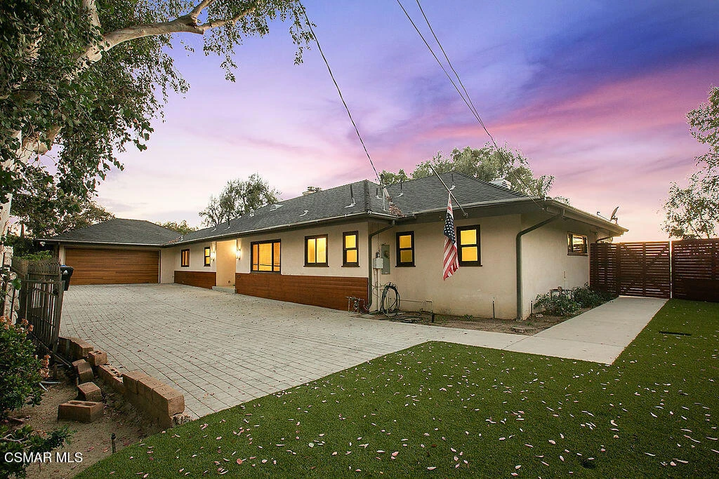 Discover your dream home with breathtaking views! Nestled in the heart of Woodland Hills, this meticulously updated mid-century modern residence sits on a private acre lot, offering stunning panoramic vistas of the San Fernando Valley. Located just South of the Blvd on a quiet, exclusive road, this single-story, gated property offers the perfect balance of seclusion and convenience, with top shopping and dining just minutes away.The home features an open-concept design that effortlessly blends indoor and outdoor living, making it ideal for entertaining. The chef's kitchen boasts elegant mahogany cabinetry, Caesarstone countertops, a Bluestar range, and a Subzero fridge, complemented by separate dining and breakfast areas. Dual fireplaces add warmth and charm to both the family and living rooms.The spacious master suite includes a luxurious en-suite bath with Carrara marble finishes and a bonus sunroom--perfect for use as an office or private retreat. Step outside into the expansive backyard, where you'll find mature trees, a cozy fire pit, and a sparkling pool, all framed by incredible sunset views that will take your breath away.Other highlights include gleaming maple floors, high-end fixtures throughout, brand new windows, and a full-sized laundry room. With easy access to shopping, restaurants, and beaches, this home truly offers the best of both worlds. A must-see to fully appreciate the lifestyle it offers--and of course, those views!