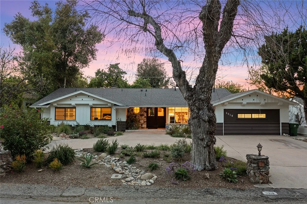 Magical single story Mid-Century ranch home desirably located South of the Boulevard. First time on the market by the original owners who built this home with love. This remodeled stunner is set back from the street behind a sweeping circular driveway, mature trees, and drought resistant landscaping. Step inside to find a formal entry foyer that leads to a completely open sunlit floor plan featuring high vaulted ceilings with skylights that bask the home with natural light. The living room features a fireplace, sliding glass doors that open to the yard, and custom built-in storage. Separate formal dining room connects the living room with the upgraded open kitchen with quartz counters, peninsula with breakfast bar seating, stainless appliances, double ovens, and pantry. An office/guest room off the entry features large picture windows, built-in bookshelves, and access to a powder bathroom. The primary bedroom is perfectly positioned on a private wing featuring French door that opens to the yard, kitchenette with sink, and en-suite remodeled bathroom with walk-in shower and designer tiling. Two additional secondary bedrooms are each well appointed and share a spacious remodeled hall bathroom with walk-in shower. The finished garage is the ideal flex space for creatives/office/gym/etc and an indoor laundry room with storage provides ultimate convenience. The private backyard is a true sanctuary for entertaining boasting the most gorgeous professionally designed idyllic grounds featuring covered patio, separate gazebo, meandering pathways with patios, and lush full growth landscaping that truly comes alive at night under the lights. Recent system upgrades include new roof (2025) and newer 200 amp electrical panel (2020). Adjacent to terrific dining & shopping, Westfield Topanga Mall & Village, Warner Center, local parks/hiking trails, & easy access to the beach and freeways.