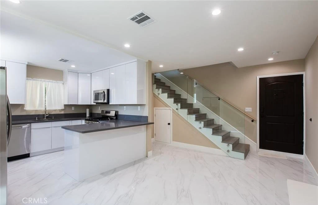 This guest house attached to the main house with its own private entrance is Located in the highly desirable area of Woodland Hills, this stunning 2-bedroom, 3-bathroom unit boasts a prime location and stylish features, including plenty of storage space. With its 2 stories, the unit features an airy open floor-plan, gleaming glossy floors, elegant baseboard moldings, recessed lighting, a stunningly crafted staircase, and a convenient laundry room on the second floor. The modern kitchen is equipped with stainless steel appliances, gorgeous granite countertops, and a cozy breakfast bar for casual dining. The bedrooms are both spacious and well-lit, with the primary bedroom offering a private bathroom, a sizable walk-in closet, and a sliding door that opens onto a balcony with beautiful tree-top views. This ADU is situated next to the main house and has its own private entrance with ample street parking available. Located near the 101-Freeways, the Warner Center, supermarkets, popular dining establishments, the Woodland Hills Branch Library, and Shoup park, this property truly has it all.