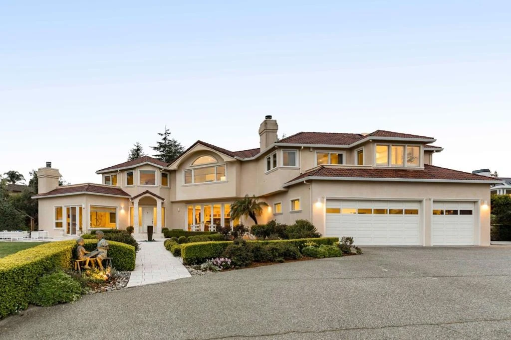 Sweeping, unobstructed San Francisco Bay views define this contemporary estate set on more than an acre in Woodside Hills, with dramatic scenery enjoyed from nearly every room. Walls of glass, soaring ceilings, and refined finishes including marble, granite, and travertine floors create a striking yet warm aesthetic throughout approximately 4,800 square feet across two levels. The expansive kitchen and family room anchor the main level, complemented by gracious formal living and dining spaces that provide multiple areas for entertaining. The upper level offers additional gathering space including a media room, along with four bedroom suites highlighted by a luxurious primary retreat with a spa-inspired bath. Outside, the grounds feature a pool and pergola-covered terrace, all oriented toward the views. Climate control ensures year-round comfort, while a gated setting offers privacy close to parks, nature preserves, and convenient commute options.
