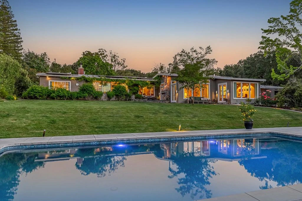 Located in the desirable Woodside Heights neighborhood adjacent to Atherton, this dramatic Mid-Century Modern home on 1.05-acres showcases a top-to-bottom designer transformation that elevates every aspect of the home's features. Single-level floor plan offers 4 bedrooms & 4 baths, 2 spacious bedroom suites (one with its own separate office) positioned at opposite ends of the home for optimal privacy with guests or extended family. High-end Walker-Zanger Italian porcelain tile floors throughout provide the look of hardwood with the superior durability & easy maintenance of porcelain. Outdoor designed for entertaining & everyday enjoyment & landscaped to enhance privacy. Sparkling pool, expansive lawn, flagstone terrace with firepit, & separate-level flagstone terrace with fireplace for gatherings. Large poolside cabana open on three sides with its own stone fireplace adds architectural interest & functionality, while the vast undeveloped space at the bottom of the property extends the sense of space & privacy & provides great potential for additional use. Private front courtyard includes an antique marble fountain & a large, wisteria-covered arbor. Complete privacy, a close-in location, & access to top-rated Las Lomitas schools further elevate this one-of-a-kind designer home.
