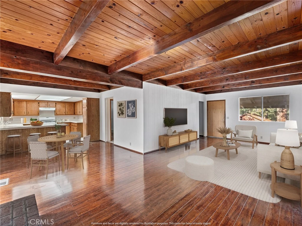 Check out this spacious 3 bedroom 2 bath single family home in the mountain community of Wrightwood offering 1,836 +/- square feet of living space. This 2-story home was just refreshed with new white interior paint downstairs (photos updated) and is incredibly inviting upon arriving with its raised and oversized front covered deck/porch to enjoy the smell and sounds of the mountains. The lowest ground level has a workshop space that can easily be converted back to the single car garage from when the home was built. You enter the home into a large living room that wraps around to the dining room, rear sun room and full kitchen. Additionally there's one bedroom and full bathroom downstairs as well as the laundry room with storage. Upstairs are two good sized bedrooms that benefit from extra large closet spaces. This home can retain its charm and be updated by updating interior paint and flooring. The backyard offers a fenced backyard with several pine trees and a serene, quiet environment to call home. The home is located not too far from downtown Wrightwood with great places to shop and eat as well as the ski resort. Wrightwood is a perfectly placed small community that offers convenient access to highways and freeways for commuting.