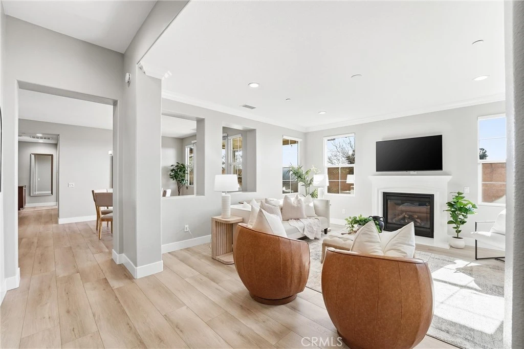 Beautiful single-level (NO Interior Steps) Encanto attached home in the highly sought-after Villaggio Community, surrounded by luxury homes, horse trails, and city-light views to the coast. This immaculate newer-built residence features over $125,000 in upgrades and offers 1,714 sq. ft. of open, light-filled living space. Highlights include high ceilings, crown molding, recessed lighting, wide-plank flooring, and tall baseboards throughout. The flexible 3-bedroom layout includes a spacious office/den option. Rare for an attached home, enjoy a grand living room with fireplace and a large dining area, ideal for entertaining .The upgraded kitchen showcases quartz countertops, a large center island, beveled glass backsplash, LED under-cabinet lighting, extensive cabinetry with built-in organization, and upgraded appliances including a newer built-in refrigerator, newer dishwasher, and 36" cooktop with oversized hood. The bright primary suite offers patio access and a spa-like bath with new seamless glass shower, soaking tub, and custom walk-in closet. Secondary bath is also upgraded. Laundry room includes floor-to-ceiling storage and deep sink. Entertain outdoors under the expansive covered patio (~384 sq. ft., 11' ceilings) with recessed lighting, fans, and power outlets. Backyard features pet-friendly turf, mature landscaping, landscape lighting, and paver storage area. Two single-bay garages, one with direct access and one with backyard access. HOA includes roof and exterior maintenance, pool, wading pool, spa, and tot lot. Additional features: tankless water heater, interior fire sprinklers, peek-a-boo city-light/coastal views, and top-rated Yorba Linda schools (zoned Yorba Linda High School).