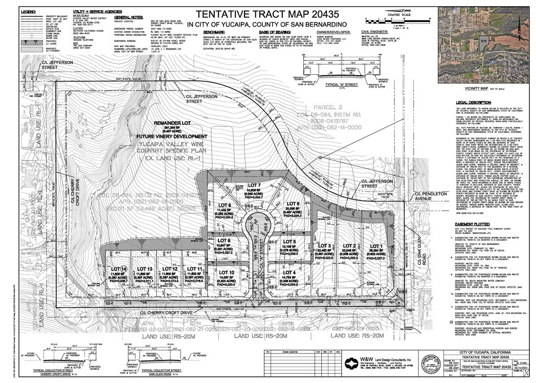 14.5 ACRES OF PRIME DEVELOPMENT LAND IN THE PATH TO THE APPLE ORCHARD OFF OAK GLEN ROAD THE PARCEL IS ZONED FOR 1 ACRE LOTS ALL UTILITIES IN THE STREET, PLANS FOR 14 LOTS TENTATIVE MAPS SUBDIVISION INTO 14 IS SUBMITTED TO THE CITY FOR APPROVAL. CAN BE SOLD IN IT'S AS IS CONDITION OR WITH APPROVED TENTATIVE MAPS. IT IS PART OF THE NEW PROPOSED YUCAIPA VALLEY WINE COUNTRY SPECIFIC PLAN WHICH WILL ALLOW SMALLER LOT SIZE REDUCING THE DEVELOPMENT COST.