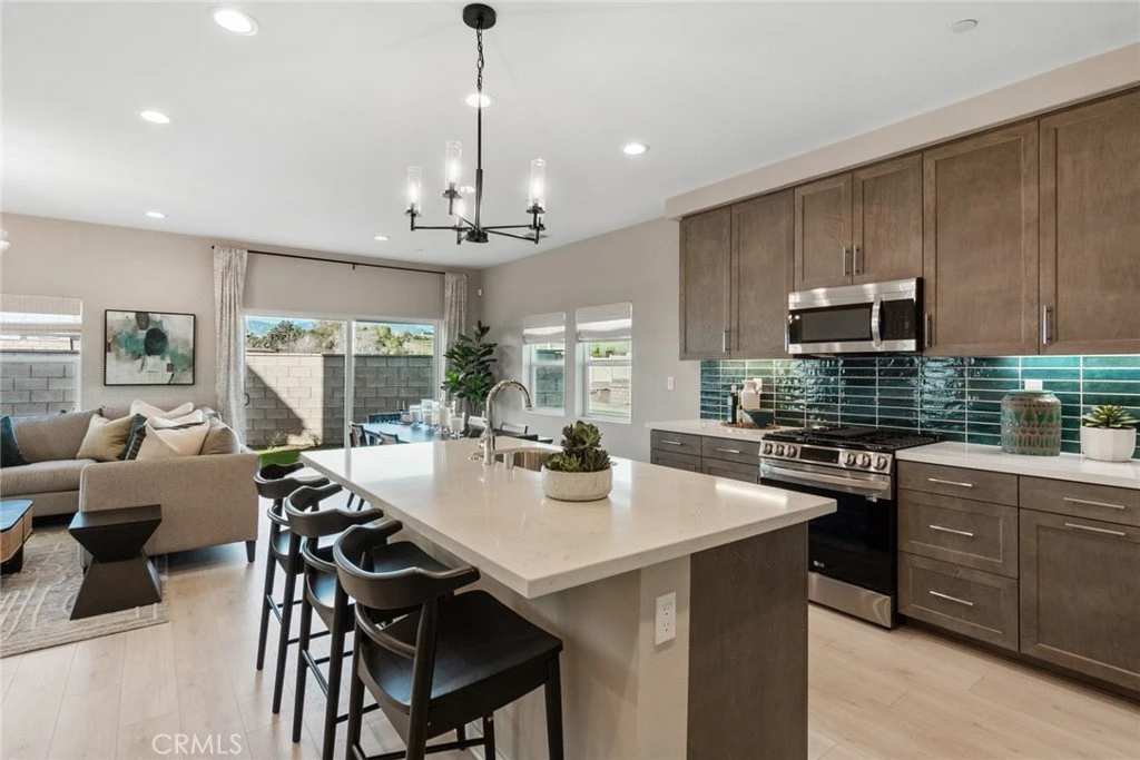 MODEL HOME, MODEL HOME, NEVER LIVED IN MODEL HOME WITH UPGRADES GALORE. SOLAR PANELS FREE. Purchase at the Community of Artisan, located in the breathtaking city of Yucaipa, known as the “Jewel of the Inland Empire” and visually framed by the San Bernardino Mountains. Great Open Floor Plan with 3 Bd plus Loft, 2.5 Bath & 2 car garage, this single-family home boasts a Craftsman exterior. Model Home includes many upgrades, including RevWood flooring on first floor, recessed lighting in Great Room, Loft and in all Bedrooms, Large kitchen island including seating bar with upgraded pendant light, kitchen under cabinet lights, Huge Walk-In Pantry w/ clear glass door, Shaker maple Cabinets with Alto finish (light grey) throughout home, Quartz kitchen countertops & custom subway tile full backsplash, included LG stainless steel refrigerator, Stainless steel LG appliance package with free standing gas range, 5 burners, microwave and dishwasher. Primary Suite with walk in closet, lush carpet, 36" high custom designed Shaker maple cabinets with upgraded Quartz counter tops, dual sinks with Peerless single lever chrome faucets, and oversized vanity mirror and tiled floors. Whole house Wi-Fi pre-wire & finish, Laundry Room with included washer/dryer, Desk at BD #3, Voluminous 9' ceilings throughout, superior Milgard Windows, Drop Zone with USB charging station. Additional custom upgrades, too numerous to list. Finished 2-car garage with steel roll up garage door and Wi-Fi garage door opener, Electric vehicle prewire in garage, RING doorbell, Alarm system, rear and side yard vinyl or block fencing. Fully landscaped Model Home located in a cul-de-sac, and across the street from a sizeable community park with picnic areas, benches & BBQ, a cornhole court, turf area for open play, & tot lot. Professionally landscaped community with included water efficient front yard landscaping with automatic sprinklers. Wi-Fi programmable thermostat & Tankless Water Heater. Minutes to 10 Freeway, close to schools, shopping, churches, Crafton Hills College and Yucaipa Regional Park. Yucaipa is adjacent to the many wonders of Oak Glen; including apple orchards & museums. 15 minutes to Loma Linda University Hospital. Photographs are of this actual model home. Furniture, artwork and accessories available at an additional cost and are not included in the price of the home.