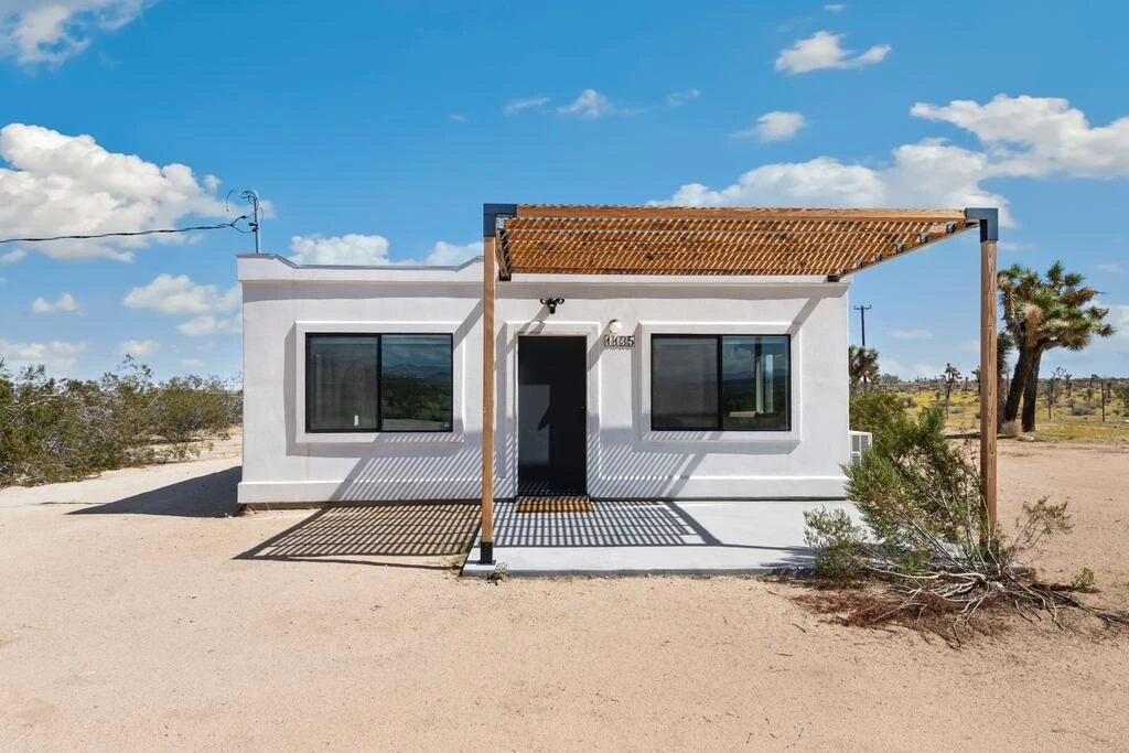 Discover this stylish modernized Spanish-style desert retreat, perfectly set on a fully fenced and gated 5.5+ acre parcel offering privacy, serenity, and endless potential. Turnkey furnished, this home is ready to enjoy as a personal escape, weekend getaway, or investment opportunity. The interior showcases exposed wood beams and a rich wood ceiling, creating warmth and character that blend seamlessly with the desert surroundings. The open floorplan connects the living area and kitchen on one side, with the living room featuring a cozy wood stove and the kitchen highlighted by bold orange cabinetry, induction stove, and mini fridge. The bedroom area includes built-in wood shelving for storage and hanging space, offering both function and charm. The updated bathroom has a vibrant blue tiled shower and skylight. Go outside to a spacious patio for lounging and entertaining, where you can soak in the panoramic desert landscape and breathtaking views in every direction. With plenty of land for expansion or simply to enjoy the peace and quiet, this unique property offers a rare chance to own a private desert hideaway that combines style, comfort, and versatility.