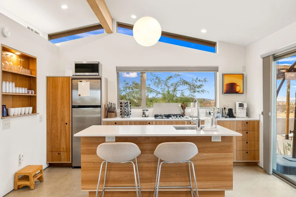 Discover this turnkey furnished, architecturally significant cabin, once featured in Dwell magazine, with over 180 current and historic 5-Star reviews on Airbnb. Nestled on a vast 5-acre lot, this home is perfect as an affordable main residence, a cozy second home, or an attractive vacation rental. The possibilities for expansion are endless. Build an additional home and/or an Additional Dwelling Unit (ADU), set up a hobby farm or a winding trail to a lush retreat! Whether you envision a peaceful sanctuary or a hub for outdoor activities, this property is a perfect canvas for realizing your dreams. The home offers an inviting blend of vintage charm and modern amenities in a tranquil desert setting. You'll find a thoughtfully designed open floor plan featuring concrete floors that add a touch of contemporary elegance. The cabin includes one spacious bedroom and a well-appointed bathroom, ensuring comfort and convenience for guests and owners alike. The inviting porch serves as an excellent spot to enjoy your morning coffee or evening sunsets while taking in the serene surroundings. A storage shed is included, providing extra room for your belongings and enhancing the functionality of this charming property. Don't miss out on this midcentury gem- perfect for those looking to own a beautifully remodeled cabin and create their own desert haven, whether for personal use or as an income-generating short-term rental.
