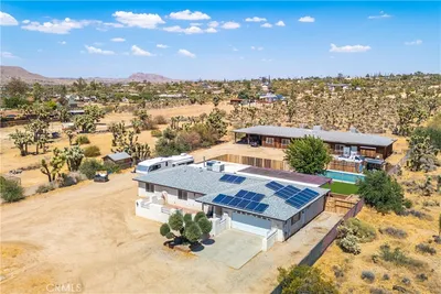 Spacious Multi-Generational Home with Guest Suite in Prime Sky Harbor Location. Looking for space, flexibility, and a beautiful setting near Joshua Tree? This rare Sky Harbor property checks every box. With 6 bedrooms, 3 bathrooms, this thoughtfully designed home is ideal for large families, multi-generational living, or buyers needing a separate guest suite or rental opportunity. Tucked into a peaceful, established neighborhood, this home offers a private backyard retreat with mature trees, low-maintenance landscaping, an automatic irrigation system, and a secluded patio-perfect for outdoor dining, relaxing evenings, or entertaining under the stars. Inside, the main home features a bright and welcoming layout with a spacious living room, a formal dining area, and a large family room that could easily become a 6th bedroom. The kitchen is fully equipped with a built-in oven, cooktop, refrigerator, dishwasher, and a breakfast bar. The primary suite includes skylights for natural light and a private bath, while two additional bedrooms and a second full bathroom provide space for the whole family. There's also a dedicated office space and an indoor laundry room for everyday convenience. One of the standout features is the private guest suite, built in 2007 with its own separate entrance. This space includes two bedrooms, a large accessible bathroom, stamped concrete floors, a cozy living and dining area, and a kitchenette with its own refrigerator. Skylights brighten the suite, and the primary bedroom includes a walk-in closet and a secure 6' built-in safe-perfect for valuables or important documents. The home is designed for year-round comfort, with two Mastercool evaporative coolers and central heating in the main house, plus HVAC and UpDux venting in the guest suite for excellent airflow. For hobbyists or outdoor enthusiasts, the oversized 3-car garage includes a full workshop with built-in drawers, cabinets, shelving, and a lean-to for additional storage-ideal for tools, gear, or weekend projects. Located just 2.2 miles from Black Rock Campground in Joshua Tree National Park and only a short walk from Essig Park (with a dog park and playground), this home offers the perfect mix of privacy, functionality, and access to nature. Washer, dryer, and two refrigerators are included-making this home move in ready!