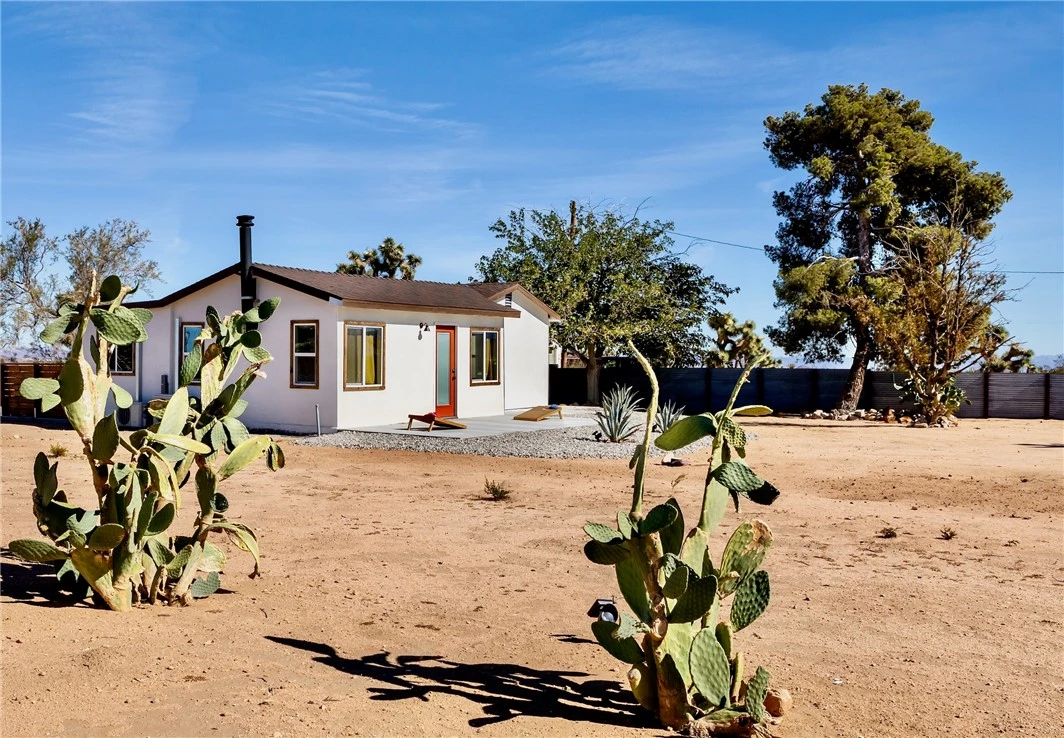 Welcome to the Aberdeen House — a fully furnished, turnkey desert retreat nestled on nearly 2 acres of private high desert land. Completely renovated down to the studs, no detail was spared. Just show up and enjoy it — or let it earn for you. Currently operating as a county-approved short-term rental with a 4.92 Airbnb rating. It's rare to find paved road access along with a lot packed with Joshua trees, beaver tail cactus, and even a 150-year-old saguaro. Enjoy a sense of seclusion all while being just 1 mile down the road from Mesa Market where you'll find a permanently stationed taco truck. The Aberdeen House is a convenient central outpost — 7 minutes to Giant Rock Meeting Room, 7 minutes to downtown Yucca Valley, 10 minutes to downtown Joshua Tree, and 15 minutes to Pioneertown. Pulling into the driveway you'll be greeted by a beautiful patina rustic steel privacy fence enclosing nearly an acre of yard space. The house and garage feature brand new white stucco, stone cladding accent walls, and stained wood trim wrapping all new dual pane windows. Inside, an ideal open floor plan floods the space with natural light and rustic wood accents. The custom floating gas fireplace sits against a rock wall sourced from a local quarry. Brand new solid wood cabinets with white quartz countertops anchor a fully equipped kitchen with all new appliances. A freshly remodeled bathroom features a large walk-in tiled shower with rain head, new vanity, and custom mirror. Each bedroom offers generous space and windows framing sweeping desert views. The backyard is where it all comes together — commanding views as far as the eye can see, a stylish furnished patio with outdoor gas fireplace, gas grill, hammocks, and a 7-person spa perfectly positioned for evening soaks beneath a star-filled sky. Additional features include a detached 2-car garage, mini-split heating and cooling, and all new electrical, plumbing, stucco, and roof. Truly turnkey — remodeled, furnished, rated, and ready. Schedule your private showing today.