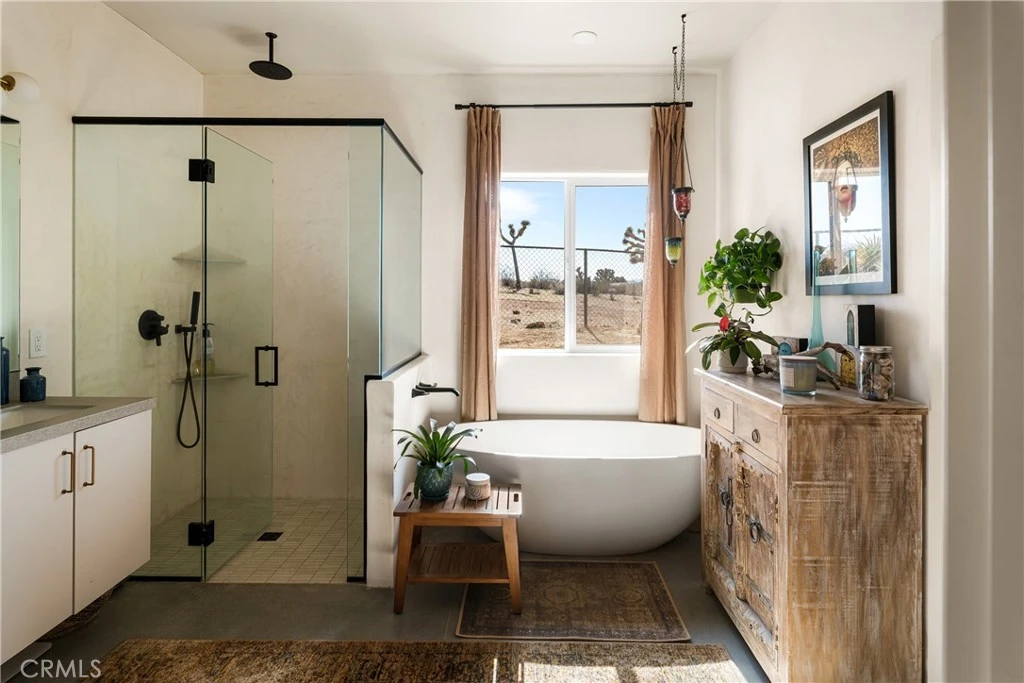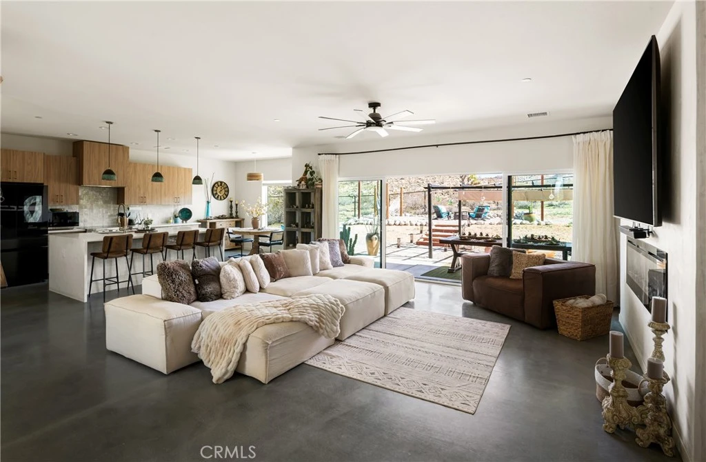 Modern living meets rural desert luxury on the Yucca Mesa, where higher elevation brings cooler summers and occasional snowfall in the winter. This newly built 2024 home features three en-suite bedrooms plus a separate powder room, high-end finishes throughout including a river rock stone sink, micro cement walls, polished concrete floors, ceramic and quartz counters, and custom light fixtures, with expansive windows and sliders framing 360° views from the Joshua Tree National Park ridgeline to the snow-capped peaks of San Jacinto and Big Bear. A long driveway sets a striking approach and guides you past the horse stables before arriving at the front gated courtyard, wrapped by a smooth stucco wall and landscaped with beautiful cacti and desert plants, centered around a built-in fire pit for sunset skies. The fenced backyard captures sunrise views, also framed by dramatic mountain backdrops. Inside, custom-designed storage cabinets run from the entry through the hallway, complemented by vertical glass panes that bring in views and soft, indirect lighting. The open-concept living, dining, and kitchen space is anchored by a large kitchen island, creating an easy flow for cooking, entertaining, and relaxing, while large sliders connect the living area to a covered patio for seamless indoor-outdoor living. The kitchen is finished with quartz counters, stainless appliances, a 36" range, and a large walk-in pantry; a conveniently located laundry room sits just off the kitchen and leads to a large attached two-car garage with additional window panels that bring in natural light. The primary suite offers a walk-in closet, private water closet, and a spa-style bath with double sinks, a separate shower, and a soaking tub positioned by a beautiful window with views. Just a few minutes from downtown Joshua Tree and the park entrance, with easy access to Pioneertown and downtown Yucca Valley, this home is ideal as a primary residence, vacation home, or short-term rental opportunity.