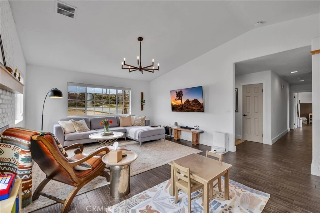 Located in Yucca Valley’s Western Hills neighborhood, this 3 bedroom, 2 bath home offers 1,522 square feet of thoughtfully designed living space on a 16,250 square foot lot. Built in 2003, the home features high ceilings, recessed lighting, tile wood-look flooring throughout, and an easy single-level layout connecting the living, dining, and kitchen areas. The living room is anchored by a wood stove insert with electric blower for efficient supplemental heat, along with central heating and cooling provided by a recently installed AC/heat pump package unit. Large windows frame sweeping desert and mountain views, creating a strong connection to the surrounding landscape. The kitchen opens to the main living areas and offers generous counter space and cabinetry suited for everyday living and entertaining. The primary bedroom is spacious and includes multiple closets and a large en-suite bath. Two additional bedrooms offer flexibility for guests, office space, or hobbies. An attached 2-car garage, propane service, and concrete driveway add to the home’s practicality and convenience. Seller describes the property as move-in ready; buyers to verify condition to their satisfaction. Outdoor living is a highlight, with a covered patio, shaded seating areas, and a filtered stock-tank style dunk pool/hot tub set against wide-open views across Yucca Valley and the surrounding hills. The backyard offers ample space to relax, gather, or further customize while enjoying expansive skies and sunsets. Set among established homes with wide streets and easy access to town amenities and Joshua Tree National Park, this Western Hills property combines comfort, function, and views in a well-established neighborhood.
